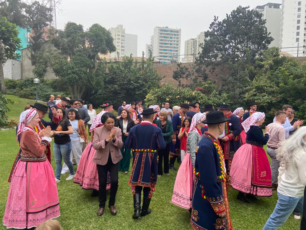17 de junio del presente año. La Embajada de la República de Polonia en Lima recibió al Conjunto Regional Mystkowianie, que vino al Perú para participar en 𝗫𝐈 𝗙𝗘𝗦𝗧𝗜𝗩𝗔𝗟 𝗜𝗡𝗧𝗘𝗥𝗡𝗔𝗖𝗜𝗢𝗡𝗔𝗟 𝗗𝗘 𝗗𝗔𝗡𝗭𝗔𝗦 𝗙𝗢𝗟𝗞𝗟𝗢𝗥𝗜𝗖𝗔𝗦 𝗬 𝗙𝗨𝗦𝗜𝗢𝗡𝗘𝗦 𝗔𝗡𝗗𝗜𝗡𝗔𝗦 𝗦𝗘𝗠𝗜𝗟𝗟𝗔 𝗙𝗢𝗟𝗞 𝟮𝟬𝟮𝟑. Al acto asistieron numerosos representantes de la comunidad polaca y peruanos.