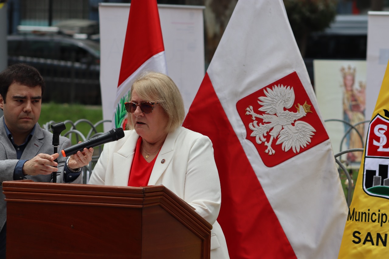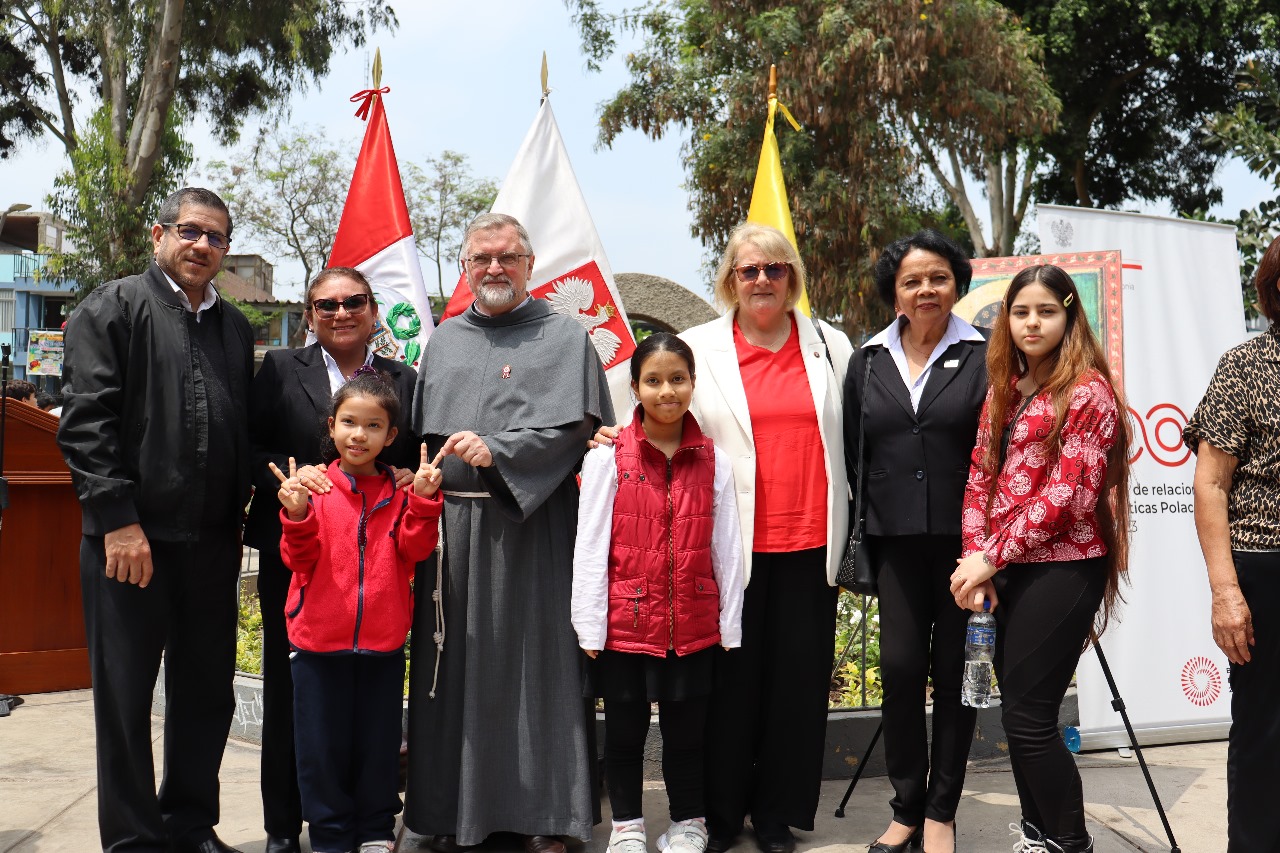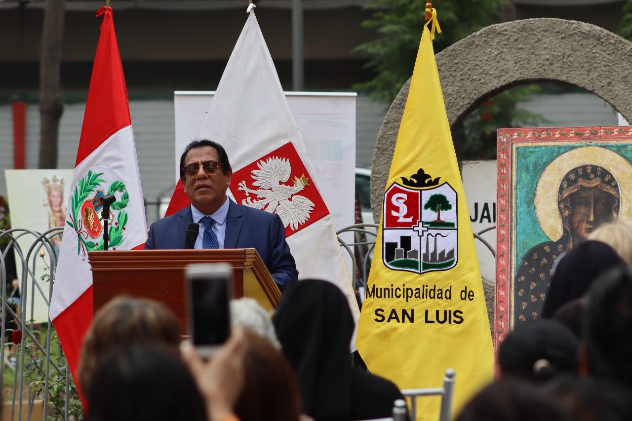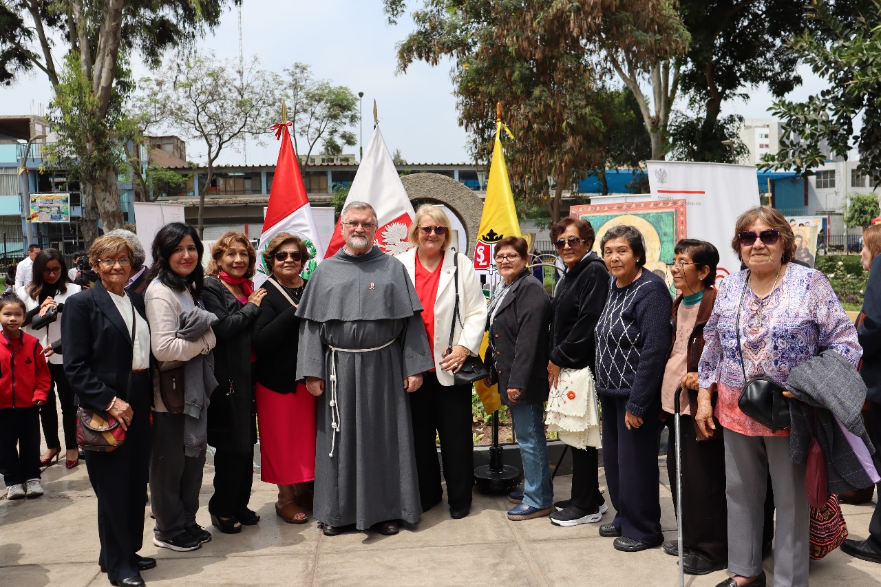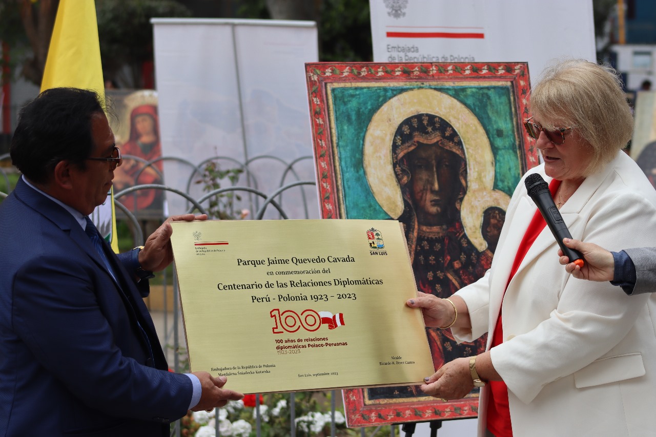 Ceremonia para conmemorar el Centenario de las relaciones Polaco - Peruanas: una placa conmemorativa del acontecimiento, donada al Alcalde de San Luis, la misma que se colocará en el parque Jaime Quevedo Cavada, junto a la iglesia donde trabajan los franciscanos polacos.