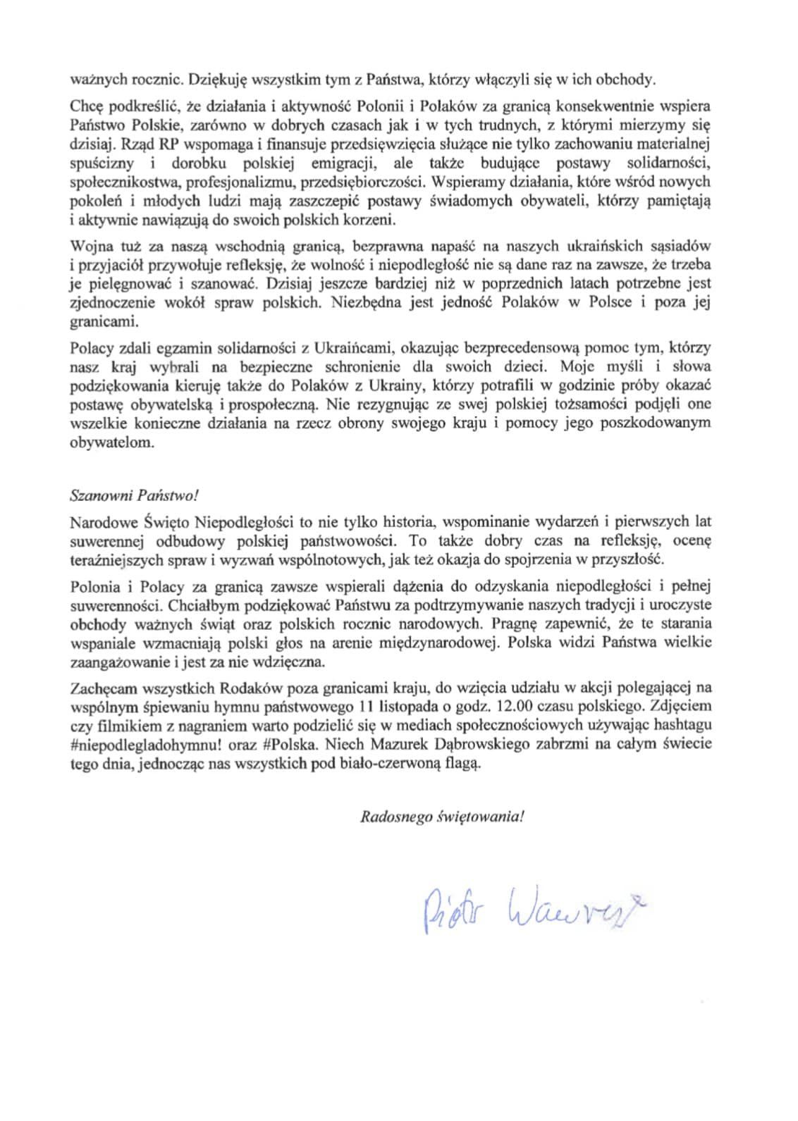 Z prawdziwą radością zwracam się do Państwa dziś, 11 listopada 2022 roku, w Narodowe Święto Niepodległości. To ogromny zaszczyt i odpowiedzialność - zajmowanie się sprawami Polonii i Polaków za granicą. Wiem jak wiele zasług dla zachowywania polskości, upamiętniania ważnych rocznic narodowych, pielęgnowania pamięci o bohaterach wnoszą środowiska polonijne. Przechowują pamięć o wysiłku i niezłomności naszych przodków w dążeniu do suwerenności i budowaniu Polski. Podtrzymują polską tożsamość poprzez pielęgnowanie narodowej tradycji, kultury i języka. Właśnie pamięć i tożsamość są nieodzowne w teraźniejszości i przyszłości narodu. Tylko dzięki nim można budować nowoczesny patriotyzm, działać na rzecz rozwoju państwowego, narodowego, społecznego.