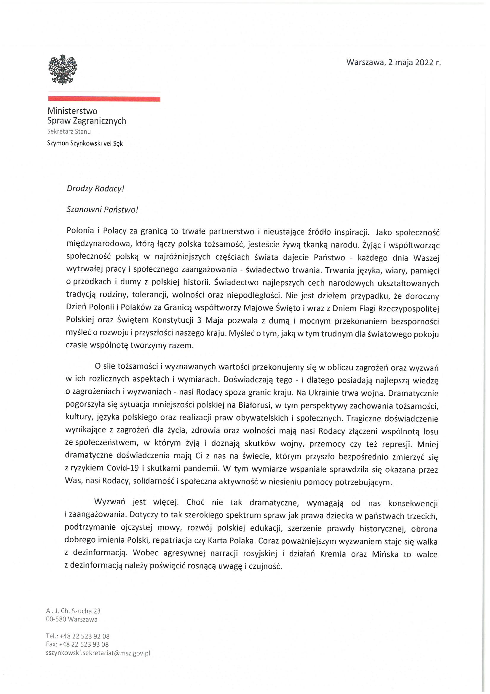 List Ministra Szymona Szynkowskiego vel Sęk z okazji Dnia Polonii i Polaków za Granicą