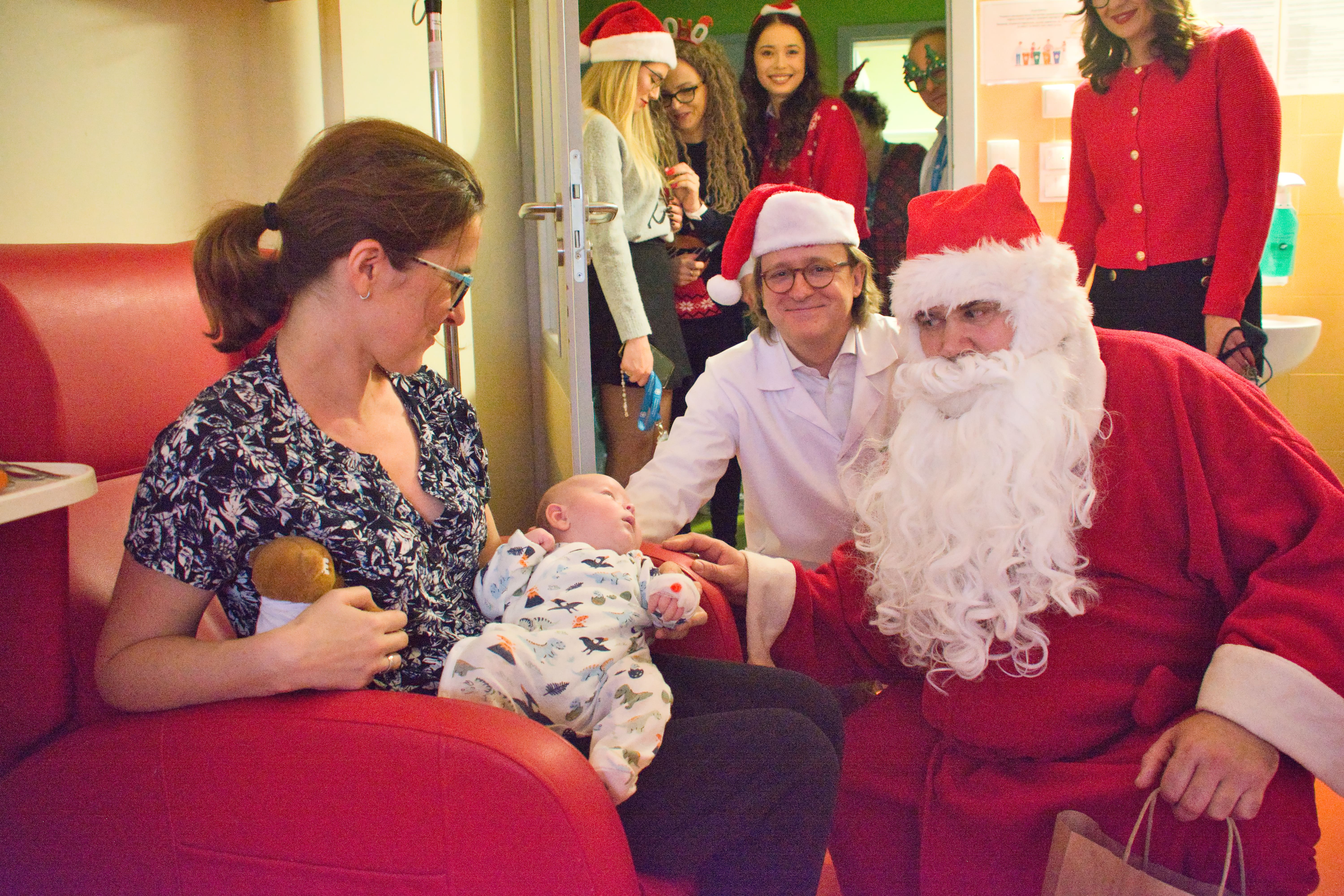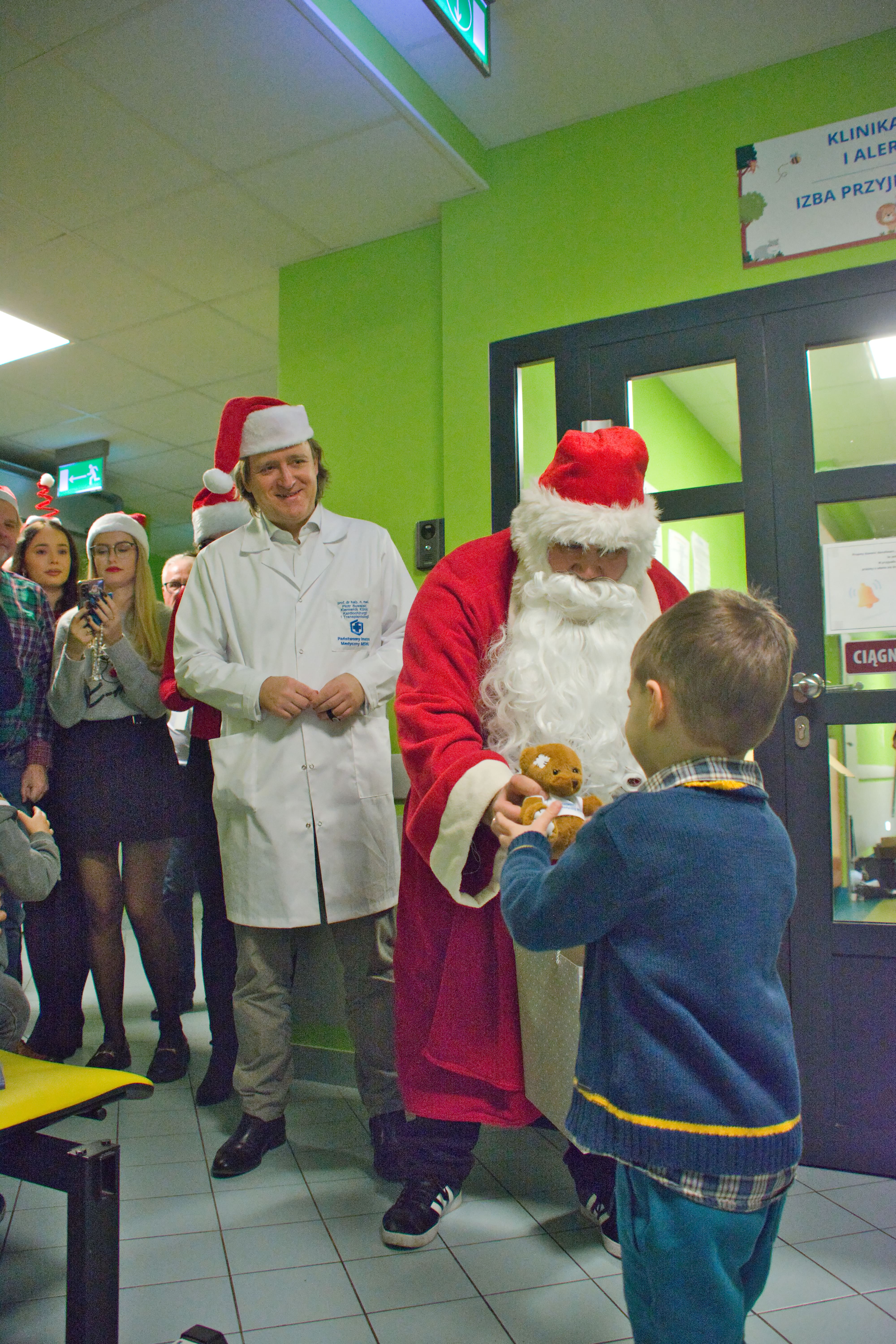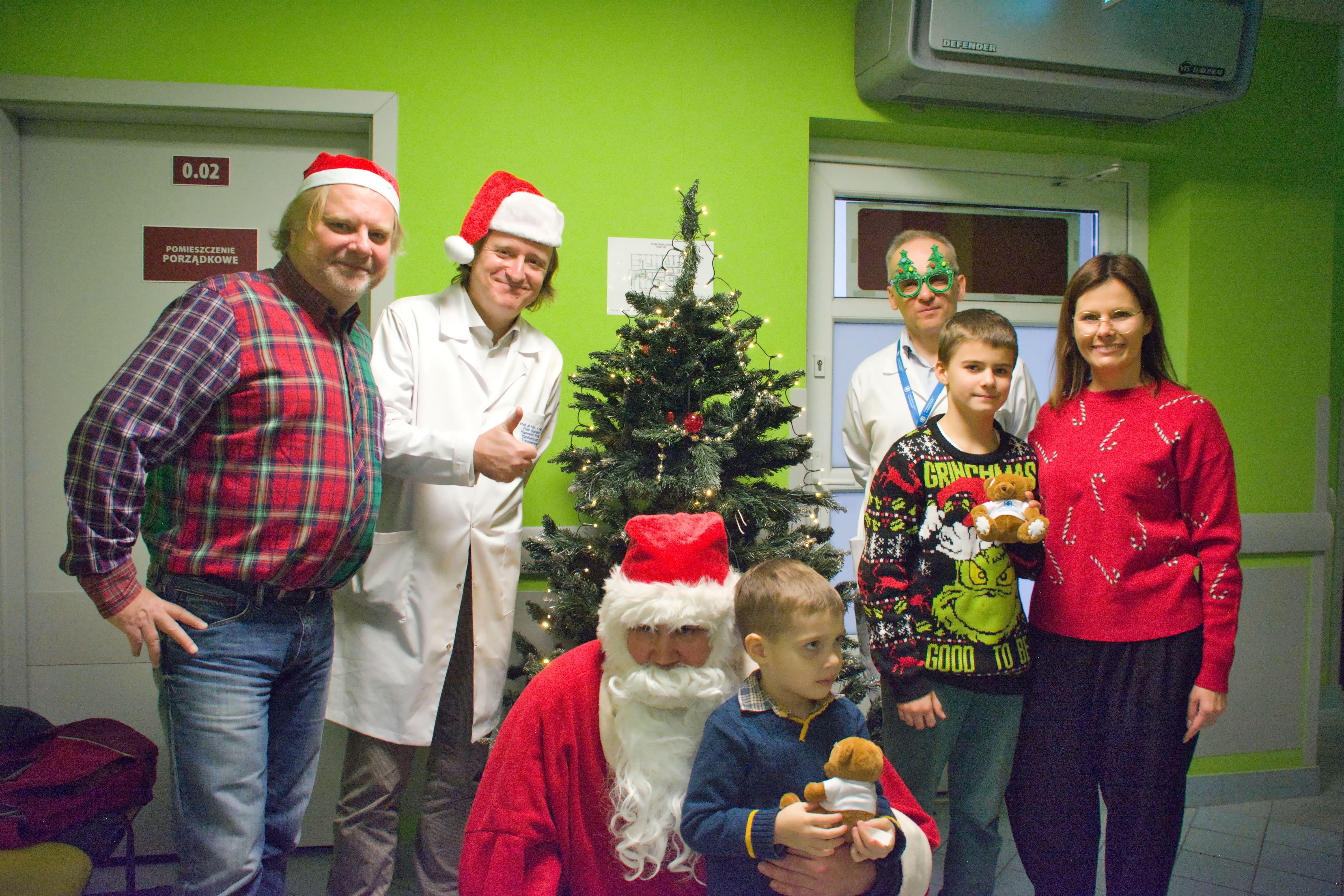 Prezenty, w asyście szefa kliniki prof. dr. hab. n. med. Adama Sybilskiego oraz śnieżynek, naszym małym pacjentom rozdawali dyrektorzy – prof. dr hab. n. med. Piotr Suwalski i dr n. med. Konstanty Szułdrzyński. W ręce dzieci trafiła nasza nowa maskotka – Pimuś 🧸. Były też życzenia i wspólne zdjęcia… 📸😊
