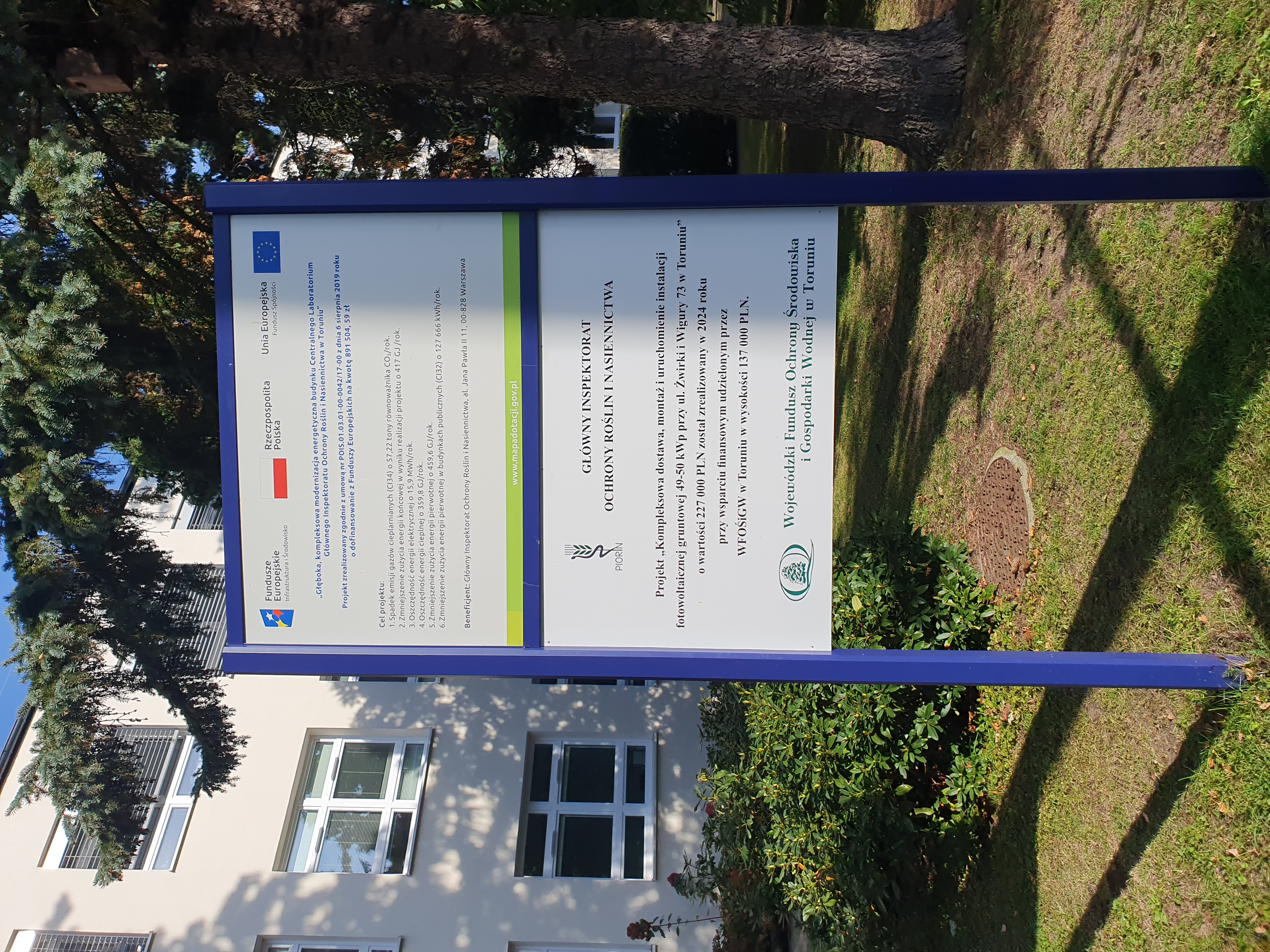 Główny Inspektorat Ochrony Roślin i Nasiennictwa w 2024 roku zawarł umowę z Wojewódzkim Funduszem Ochrony Środowiska i Gospodarki Wodnej w Toruniu na dofinansowanie zadania pn. „Kompleksowa dostawa, montaż i uruchomienie instalacji fotowoltaicznej gruntowej 49-50 kWp przy ul. Żwirki i Wigury 73 w Toruniu” .