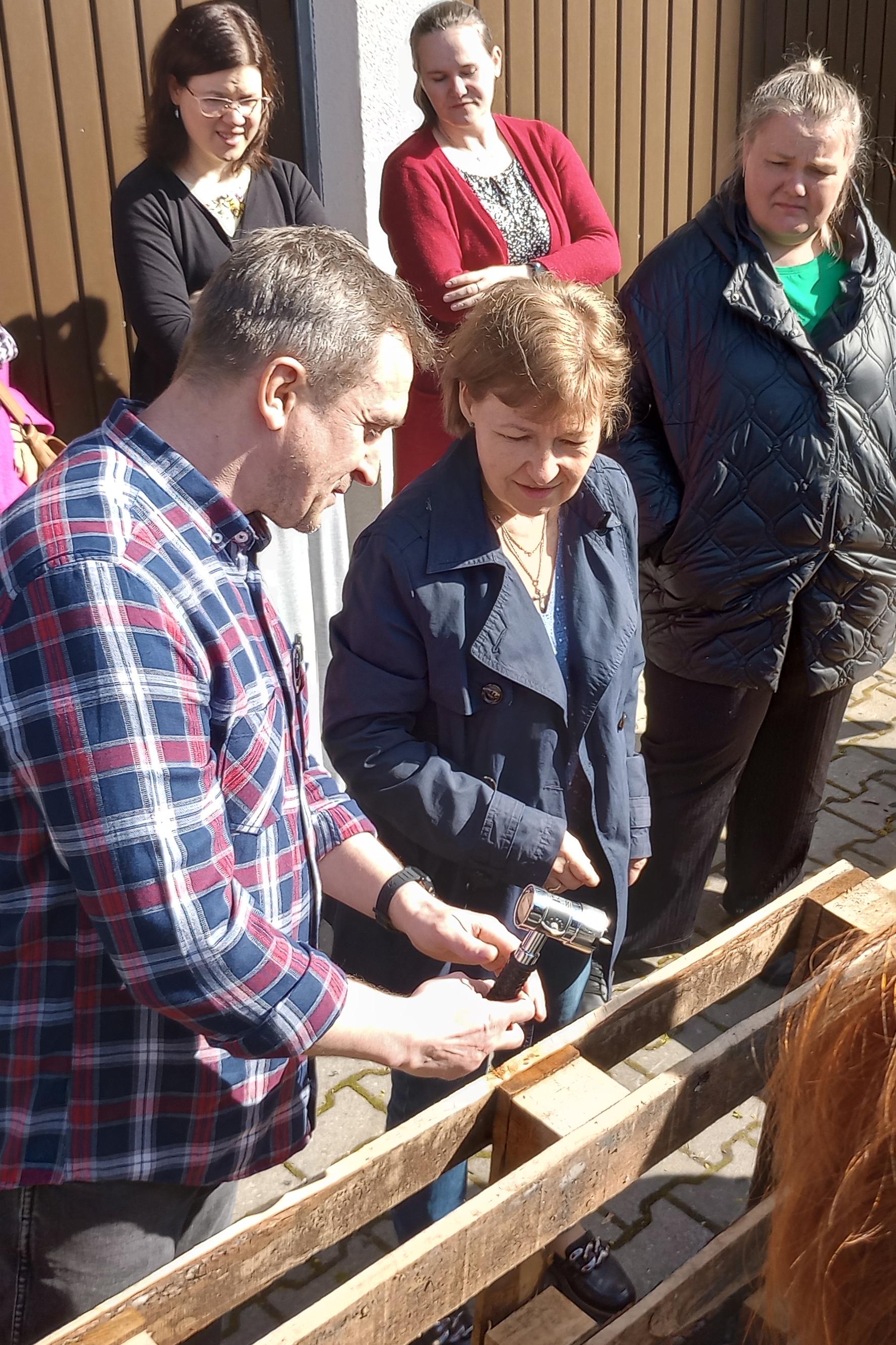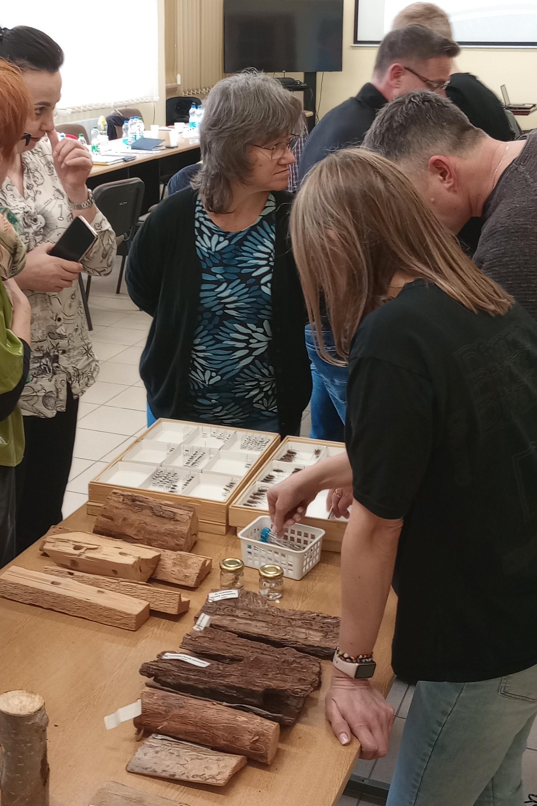 Duża część szkolenia była poświęcona przedstawieniu działań kontrolnych na przykładzie rozwiązań funkcjonujących w Oddziale Granicznym w Koroszczynie (WIORiN w Lublinie). Kierownik Oddziału - Jacek Janiszek w interesujący sposób przekazał informacje, dotyczące organizacji kontroli przesyłki (przygotowanie planu kontroli, analiza specyfiki Punktów Kontroli Granicznej, typowanie przesyłek do kontroli urzędowej, mechanizm zarządzania przesyłkami trafiającymi do UE), sposobów prowadzenia inspekcji drewna oraz przygotowania próbek do przekazania do badania laboratoryjnego. Przy udziale swoich współpracowników zaprezentował w praktyczny sposób pobieranie próbek drewnianego materiału opakowaniowego z użyciem odpowiednich narzędzi. Następnie uczestnicy szkolenia mieli okazję samodzielnie przećwiczyć zaprezentowane czynności.