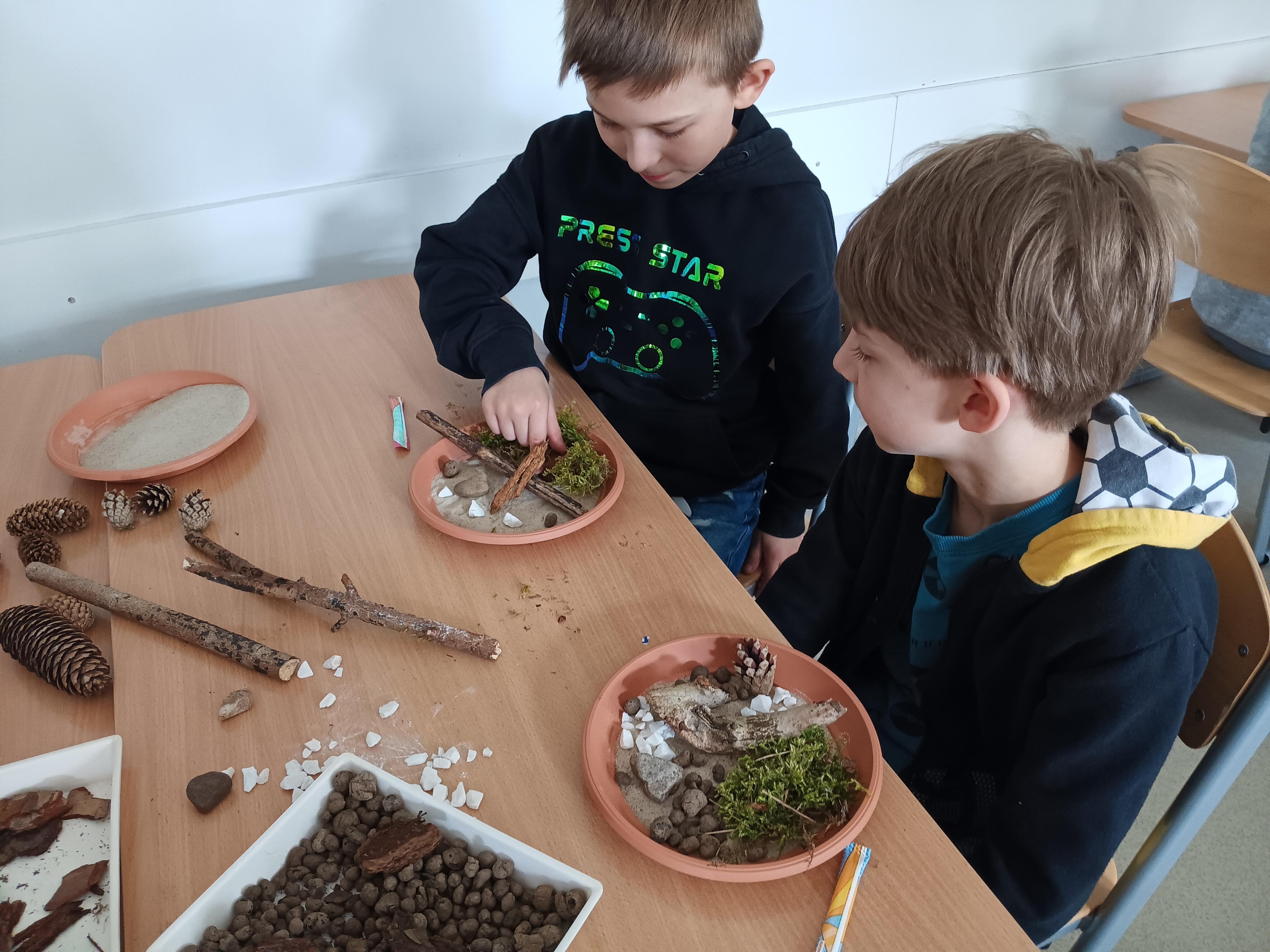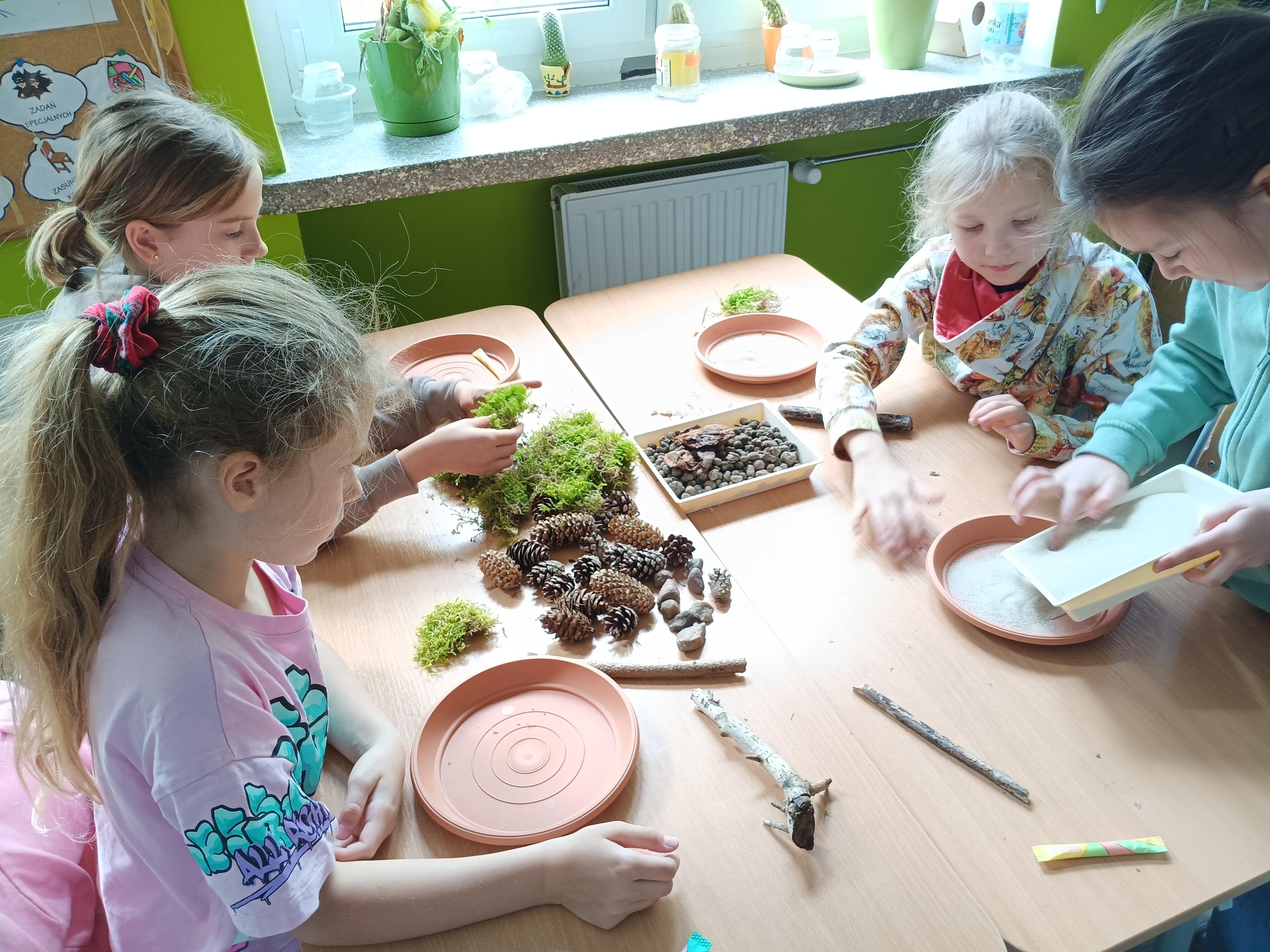 Nieco starsi uczniowie zadbali o losy pszczół w nadchodzącym sezonie. Na warsztatach zbudowali poidełka dla owadów z wykorzystaniem różnych naturalnych elementów. Następnie pierwszoklasiści zwrócili uwagę, że zapylacze powinny również „mieć co zjeść”. W myśl tej idei wspólnie zabraliśmy się do utworzenia łąki kwietnej z roślin miododajnych, i co ważne, kwitnących w różnych terminach.
