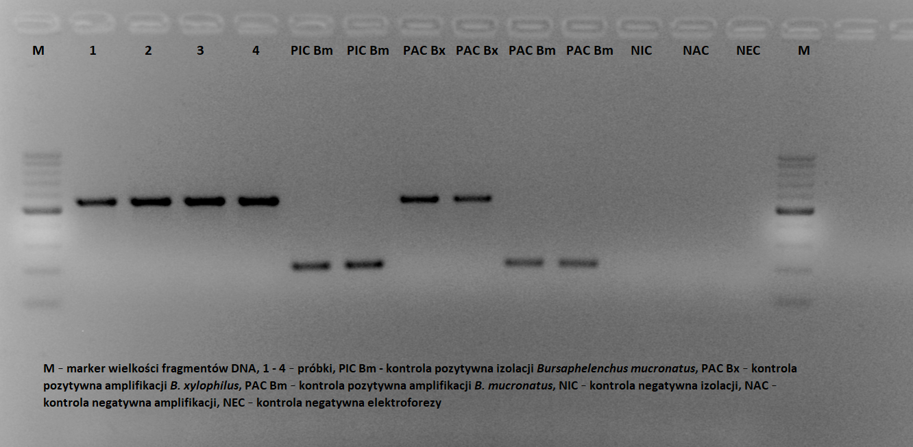 W wyniku morfologicznej analizy mikroskopowej w badanej próbce stwierdzono obecność nicieni posiadających cechy grupy „xylophilus”, które w dalszej kolejności poddano badaniom z wykorzystaniem metod molekularnych. Zastosowana metoda PCR wykazała, że nicienie należą do gatunku B. xylophilus, co w ramach programu weryfikacji wyników badań zostało również potwierdzone przez Referencyjne Laboratorium Fitosanitarne w Toruniu.