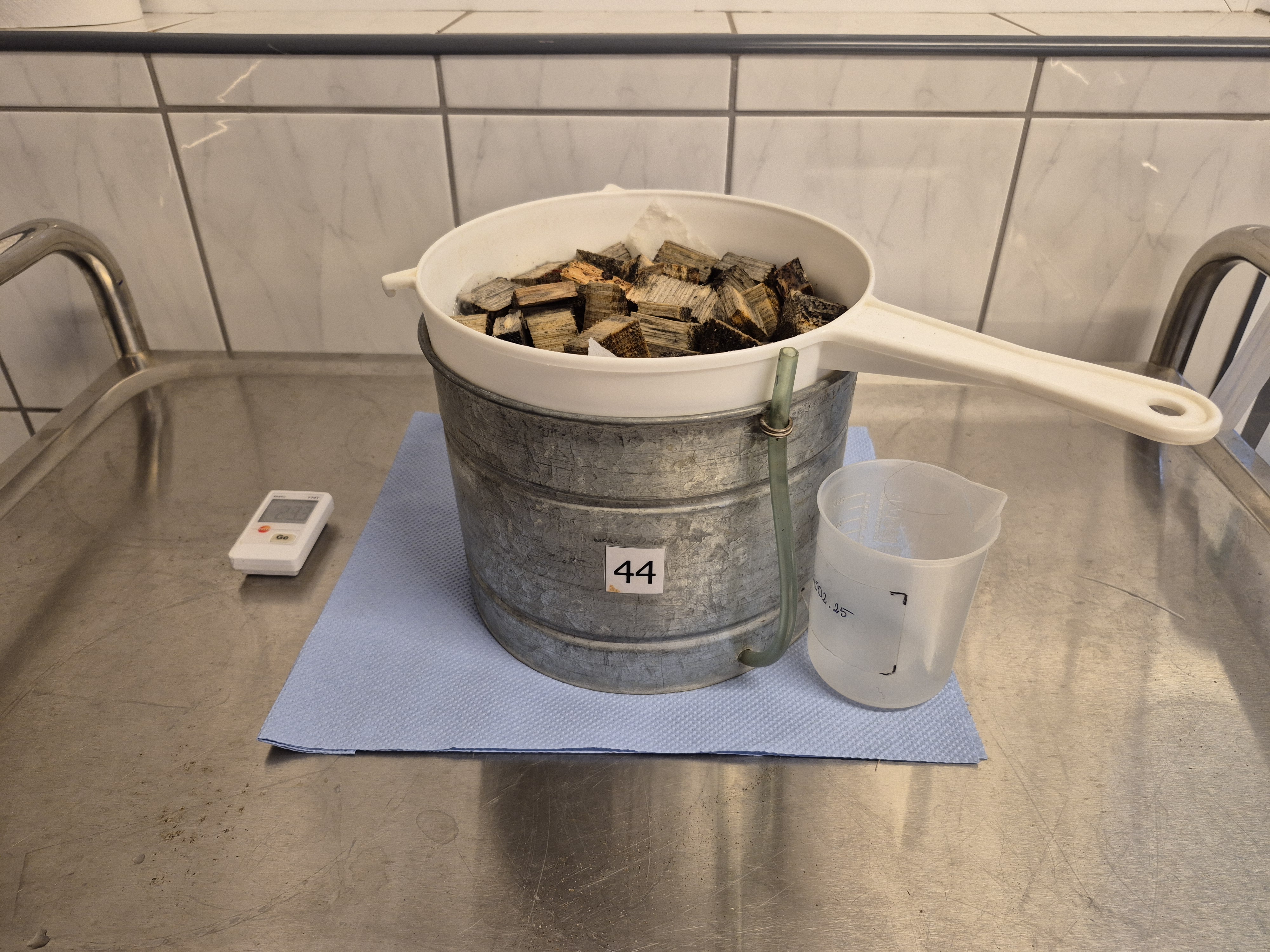 Po wymaganym okresie inkubacji próbkę poddano ekstrakcji nicieni z zastosowaniem metody Baermanna, polegającej na umieszczeniu rozdrobnionych kawałków drewna w sitkach osadzonych w specjalnych lejkach i zalaniu próbki wodą na 24 godziny. W temperaturze pokojowej nicienie stopniowo przechodzą z drewna do wody, którą następnie poddaje się analizie.
