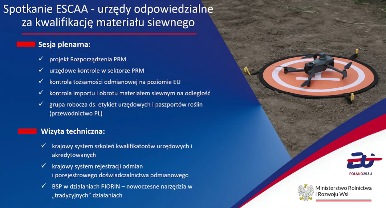 - Konferencja urzędów certyfikujących materiał siewny – zorganizowana w Krakowie z udziałem przedstawicieli unijnych instytucji. Obok sesji formalnych odbyły się wizyty techniczne, pokazy polowe oraz prezentacje z zastosowaniem dronów w inspekcji plantacji. Wydarzenie spotkało się z dużym zainteresowaniem i zapytaniami o możliwość szkoleń dla ekspertów z innych państw członkowskich UE.
