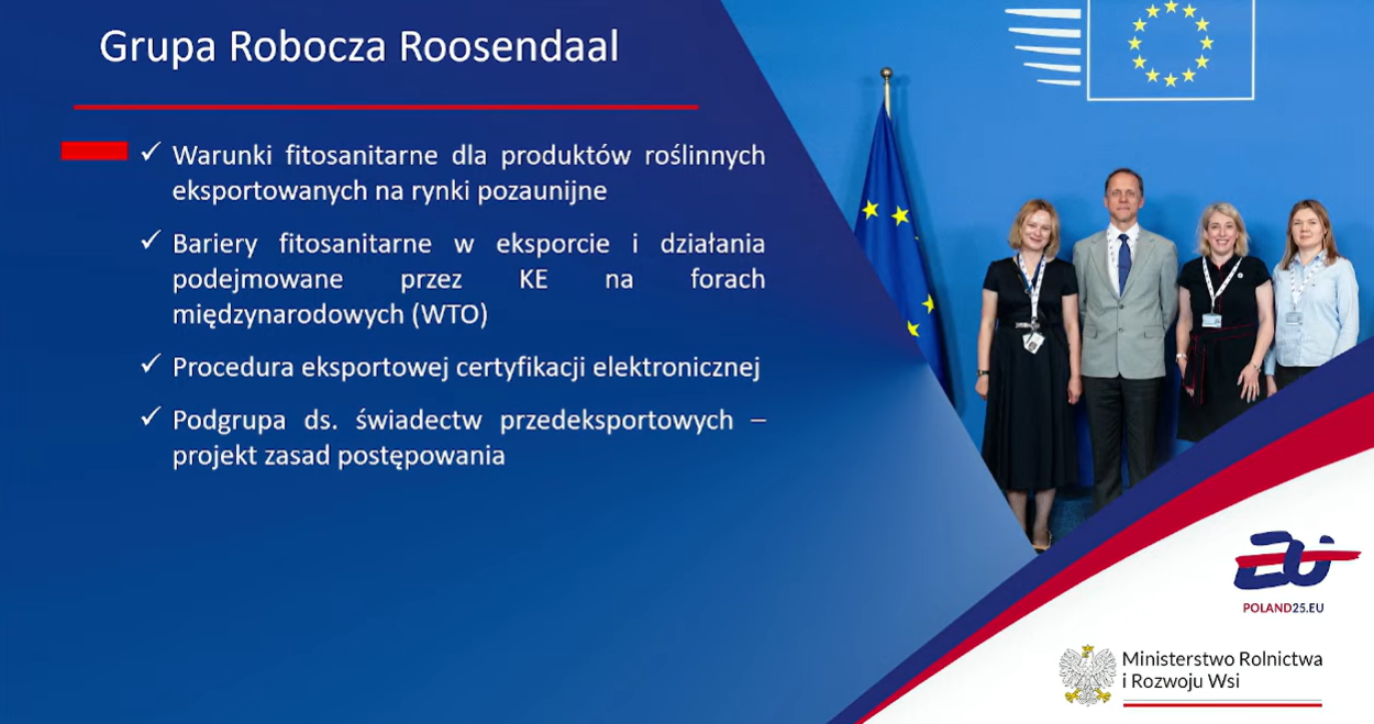 - Grupa robocza Głównych Inspektorów Zdrowia Roślin – odbyły się dwa spotkania formalne w Brukseli oraz jedno spotkanie nieformalne w Warszawie. Wystąpienie ministra Siekierskiego podczas warszawskiego spotkania zostało bardzo dobrze przyjęte przez uczestników jako merytoryczne i ukierunkowane na rozwój eksportu oraz współpracę międzynarodową. GIORiN zainicjował dyskusję na forum unijnym na temat uproszczonych procedur dopuszczania środków ochrony roślin w sytuacjach nagłych, w odpowiedzi na pojawiające się wraz ze zmianami klimatu nowe szkodniki i choroby roślin.
