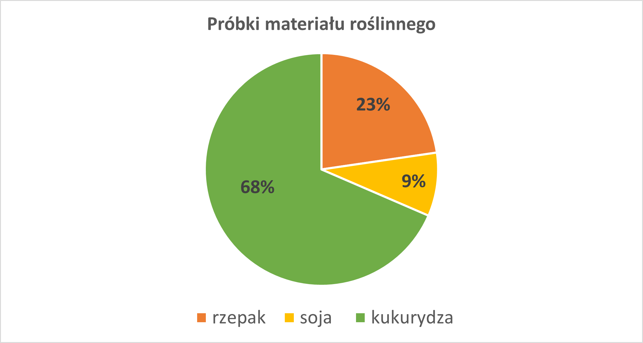 Przedmiotem badań były próbki materiału siewnego i materiał zielony - fragmenty liści pobierane z roślin w okresie wegetacji. Większość próbek - 68% stanowił materiał roślinny kukurydzy, udział próbek materiału roślinnego rzepaku w ogólnej liczbie próbek wyniósł 23%, a soi 9%.