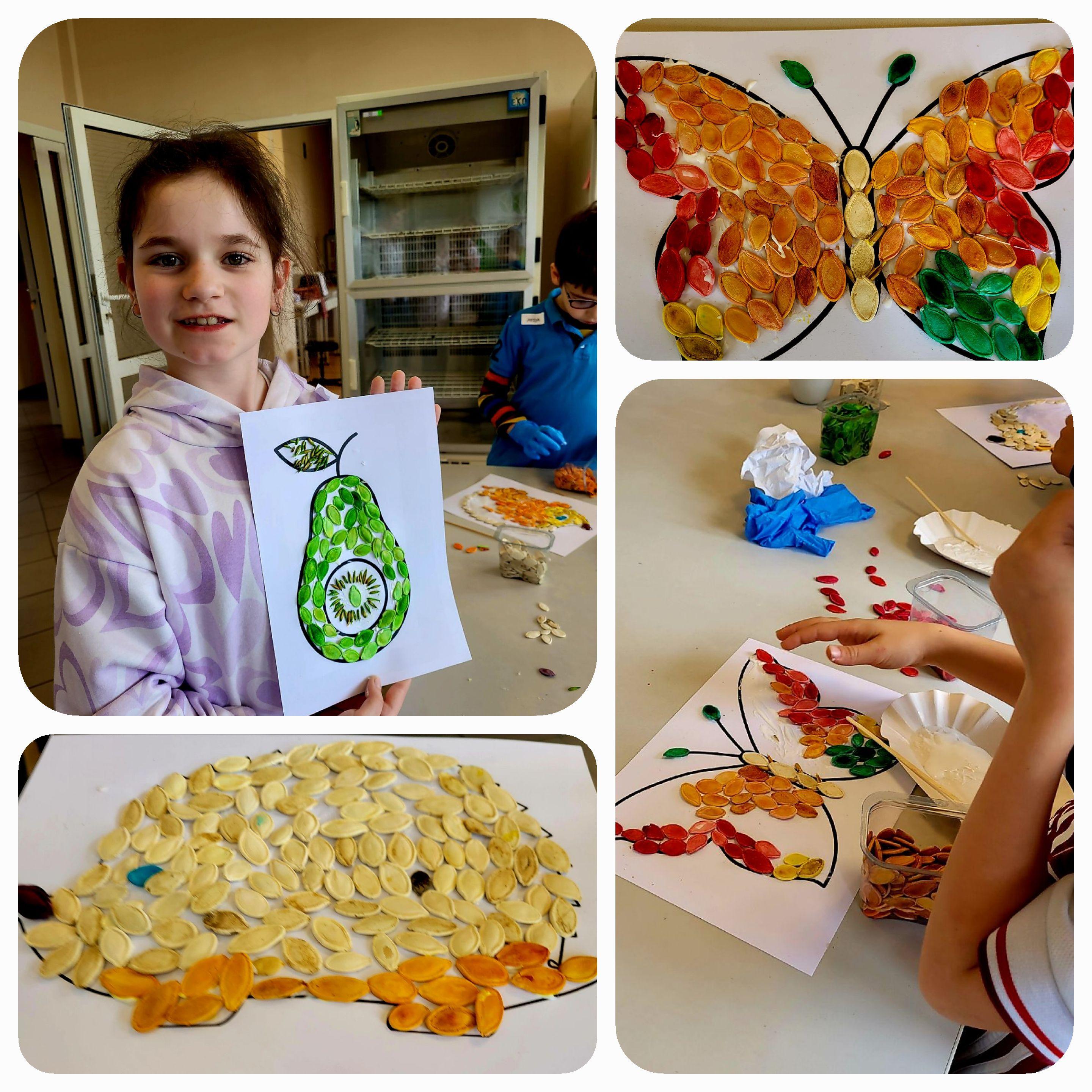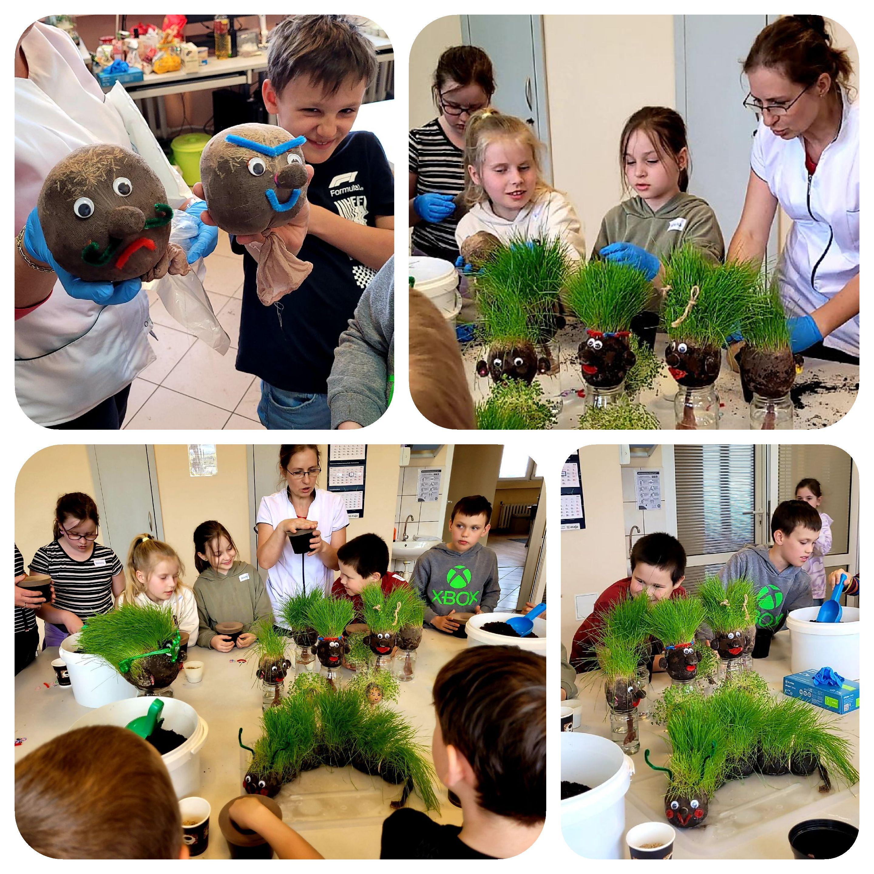 Była też okazja do wykonania obrazków z barwionych nasion dyni zwyczajnej, owsa zwyczajnego i życicy trwałej, na przygotowanych szablonach. Po powtórzeniu wiadomości o czynnikach wpływających na kiełkowanie i wzrost roślin, uczniowie stworzyli trawiastego skrzata. Dostali zadanie dalszego dbania o jego zieloną czuprynę.