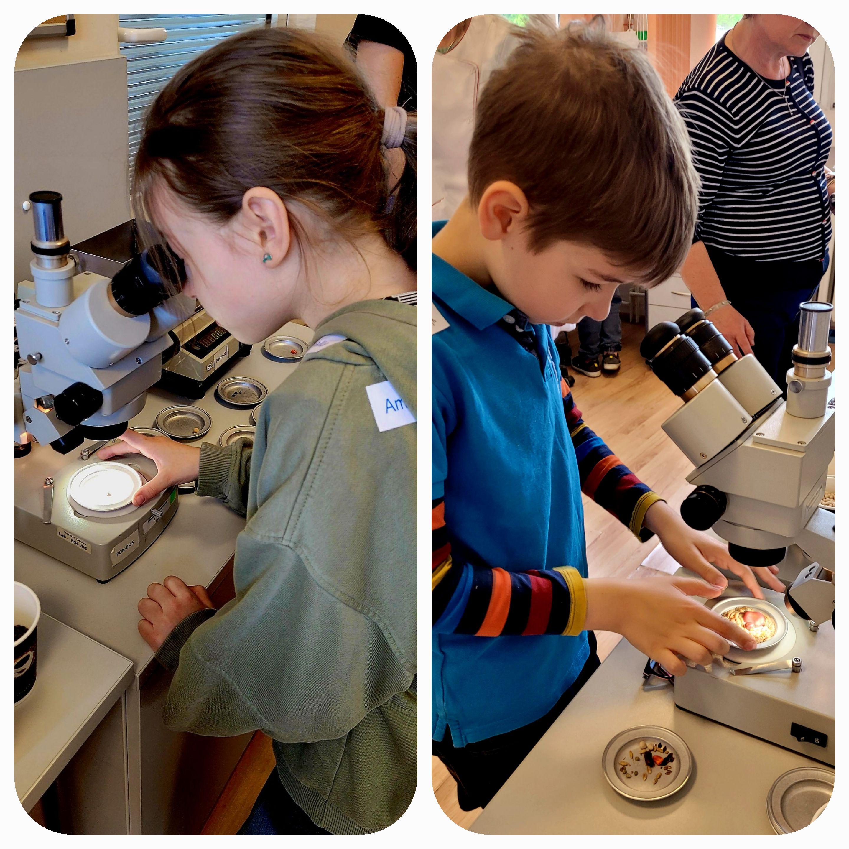 Uczniowie przy pomocy lupy i mikroskopu stereoskopowego obejrzeli nasiona zdrowe i uszkodzone przez szkodniki magazynowe, a także sprawców dokonanych zniszczeń. Porównali też wygląd siewek różnych gatunków warzyw i zbóż. Przyszli analitycy nasienni poszukiwali nasion w świeżych warzywach i owocach.