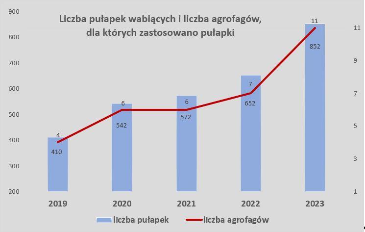 W latach 2017 – 2023 w Polsce wykonano różną liczbę ww. działań kontrolnych. Od 2019 r., oprócz kontroli wizualnych, wykorzystuje się pułapki feromonowe. W 2023 r. zastosowano pułapki dla 11 agrofagów - Agrilus planipennis, Anoplophora chinensis, Anoplophora glabripennis, Aromia bungi, Bactericera cockerelli, Monochamus (wektor Bursaphelenchus xylophilus), Dendrolimus sibiricus, Popillia japonica, Rhagoletis pomonella, Spodoptera frugiperda, Thaumatotibia leucotreta, a liczba pułapek corocznie wzrasta.