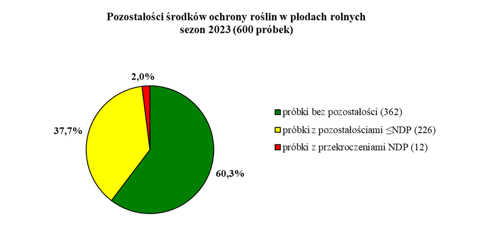 Badaniami kontrolnymi w 2023 roku w LBPŚOR objęto łącznie 14 upraw. W 362 próbkach, stanowiących 60,3% ogółu analizowanych próbek, nie wykryto pozostałości środków ochrony roślin. Pozostałości środków ochrony roślin stwierdzono w 238 próbkach (39,7%), z czego 226 próbek (37,7%) zawierało pozostałości mniejsze lub równe najwyższym dopuszczalnym poziomom (NDP) oraz pozostałości powyżej NDP, ale nie zakwalifikowane jako przekroczenia NDP po uwzględnieniu 50% niepewności, natomiast 12 próbek (2,0%) zawierało pozostałości przekraczające NDP. W 76 próbkach (12,7%) wykryto substancje czynne środków ochrony roślin niedopuszczonych do stosowania w danej uprawie. W 7 próbkach (1,2%) stwierdzono jednocześnie zastosowanie związków niedopuszczonych do stosowania w ilościach przekraczających NDP.