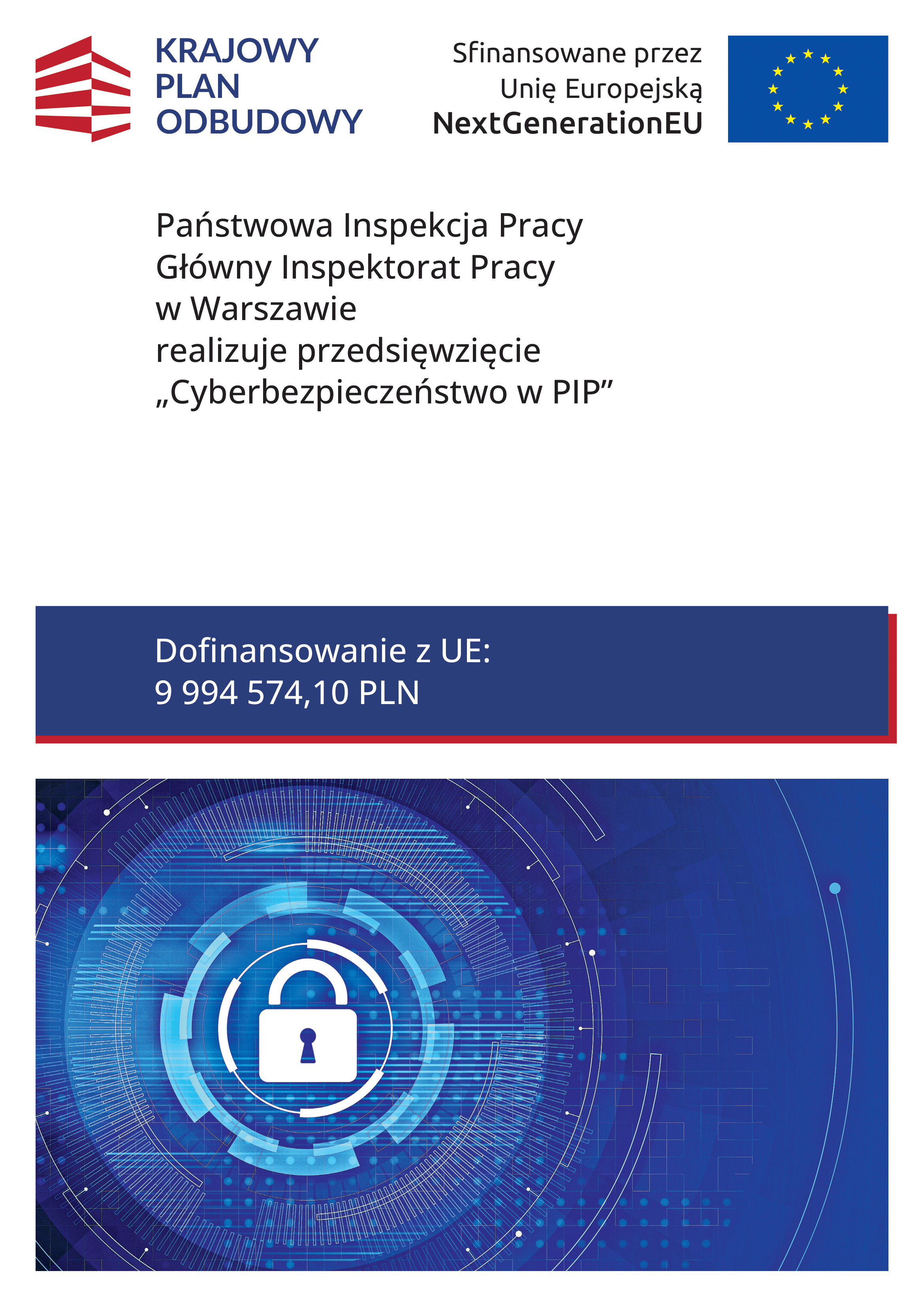 PIP informuje, iż realizuje projekt pn. „Cyberbezpieczeństwo w PIP”, Program: Krajowy Plan Odbudowy i Zwiększania Odporności; Priorytet: C3 Cyberbezpieczeństwo; Działanie: C3.1.1. Cyberbezpieczeństwo - CyberPL – numer porozumienia o powierzenie grantu KPOD.05.10- CR.01-001/24/0036/ KPOD.05.10-CR.01-001/25/2025.