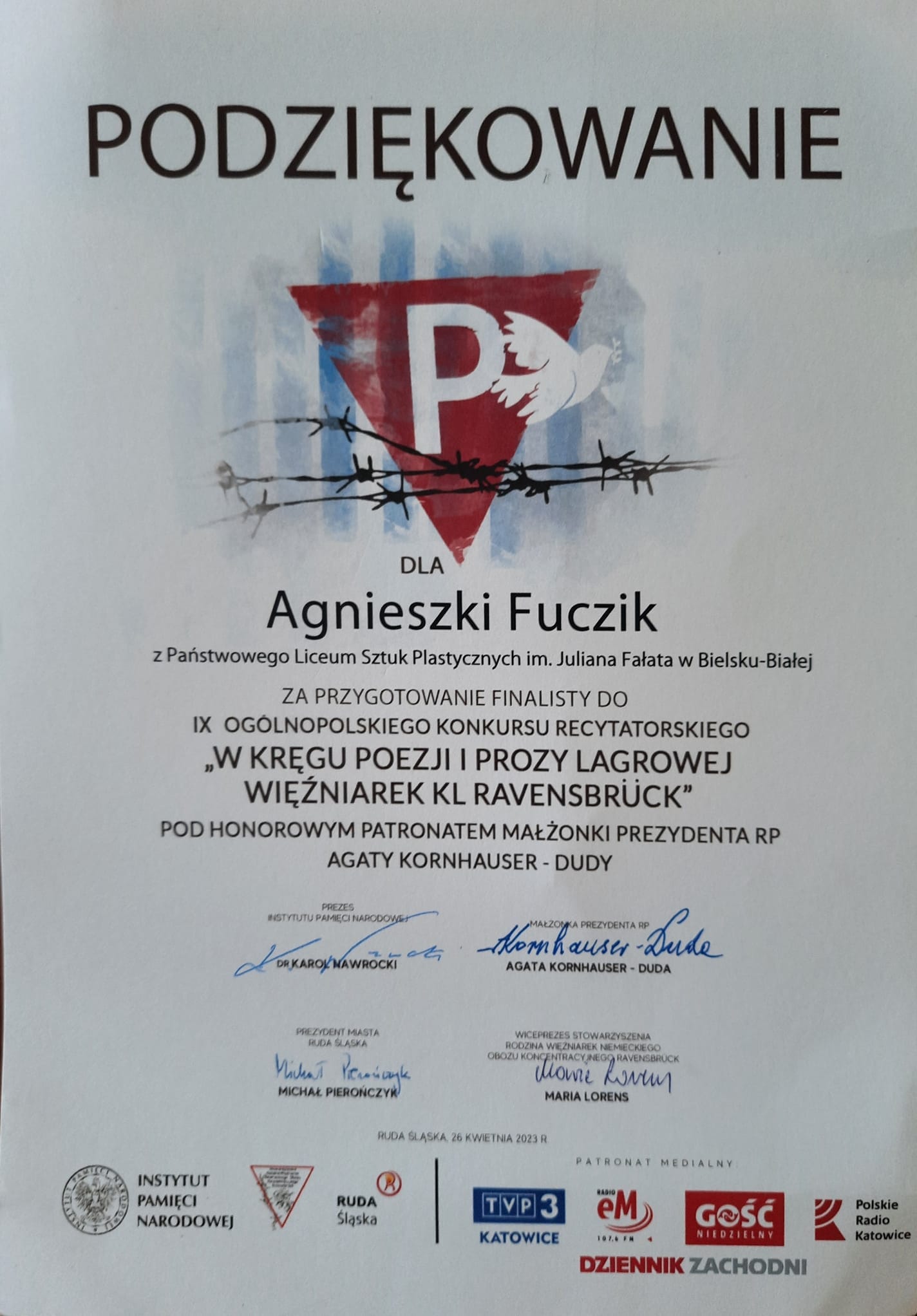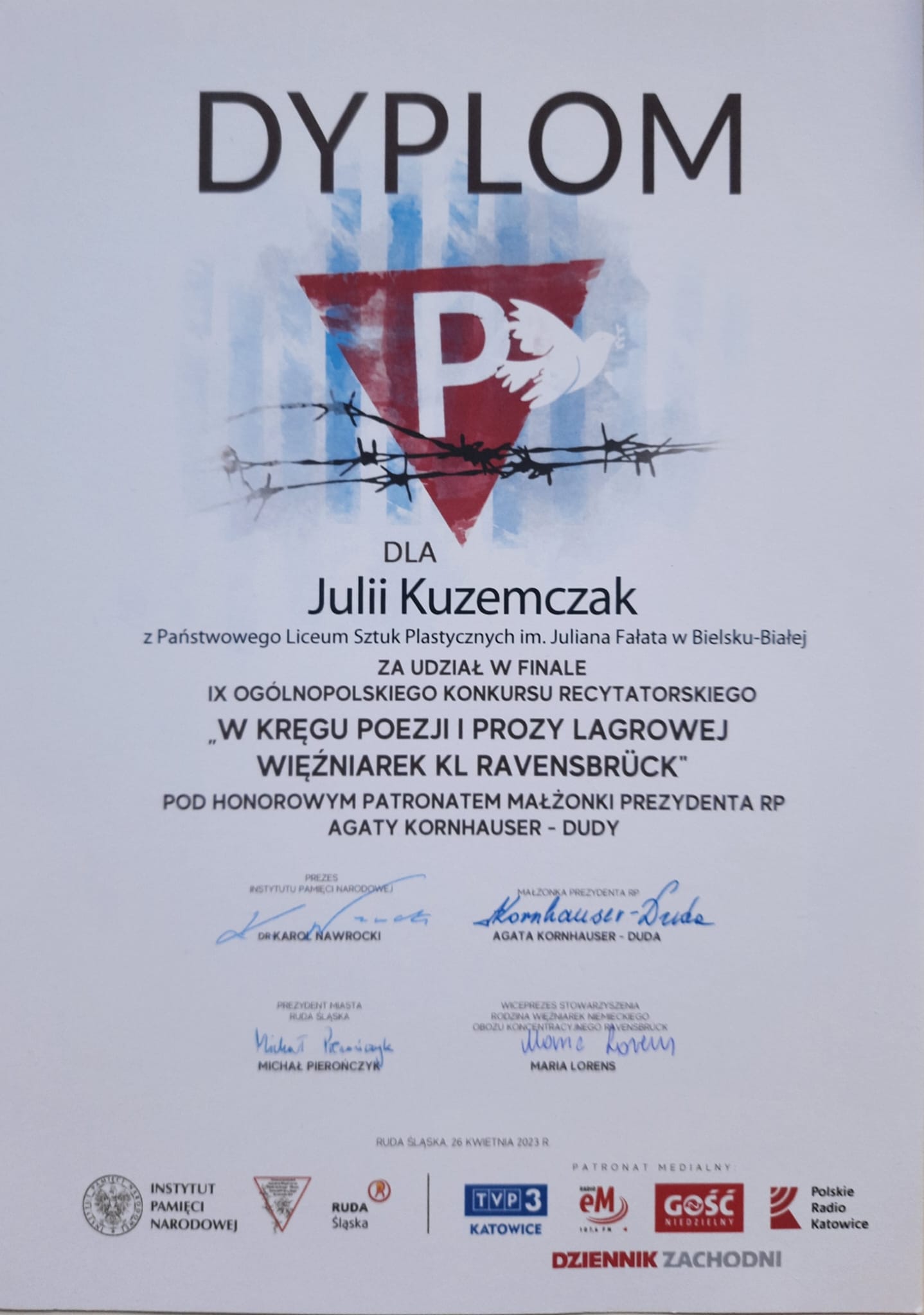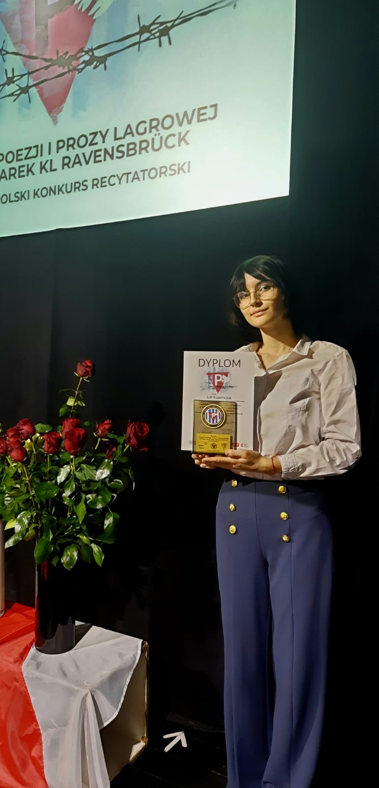 Julia Kuzemczak, uczennica klasy 2c, wzięła udział w finale IX Ogólnopolskiego Konkursu Recytatorskiego „W kręgu poezji i prozy lagrowej więźniarek KL Ravensbruck”.