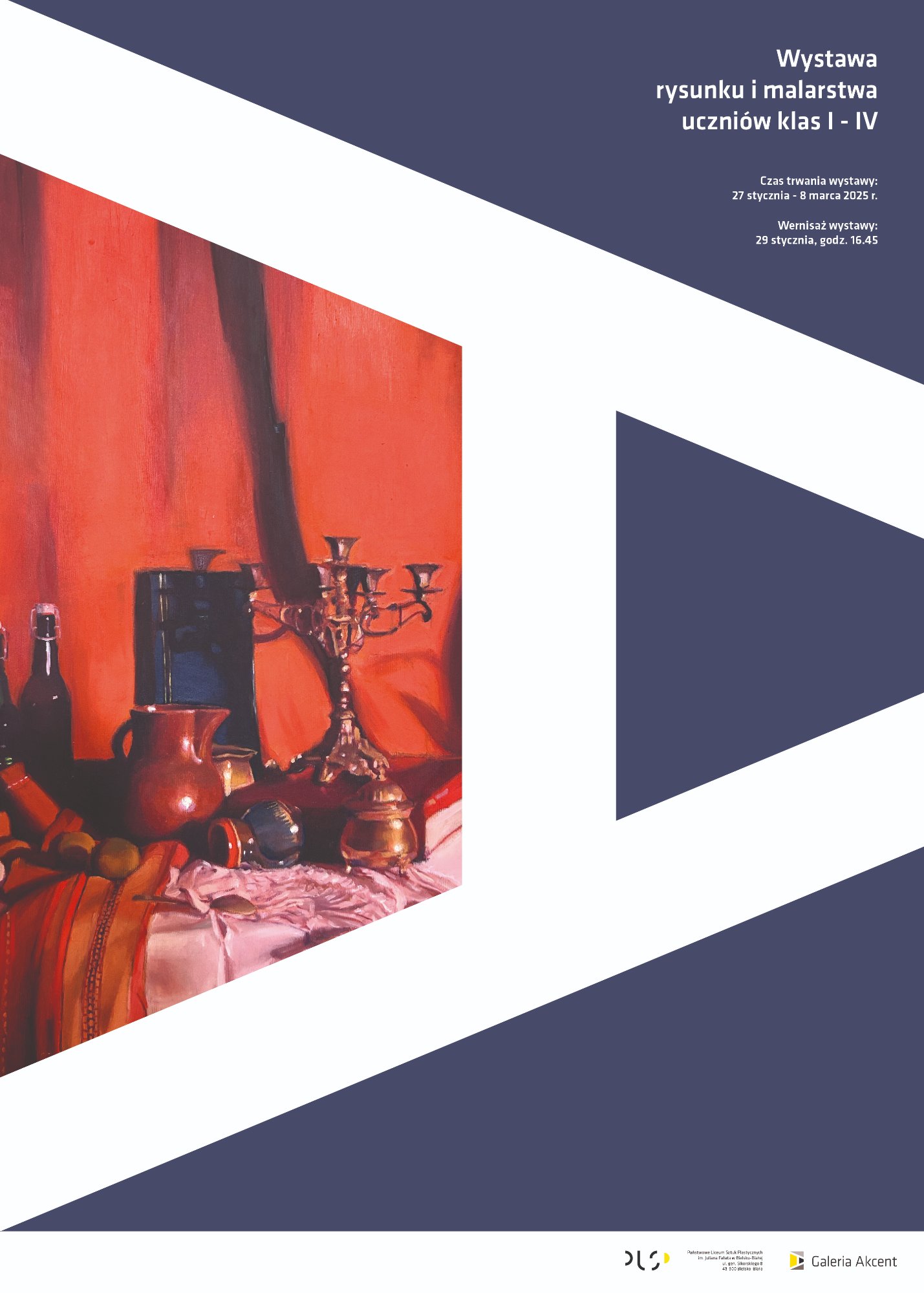 Na ścianach galerii Akcent zawisły najlepsze prace z zakresu rysunku i malarstwa uczniów klas pierwszych, drugich, trzecich i czwartych. Parter jest w całości poświęcony rysunkowi klas 3 i 4. Dominują takie tematy jak rysunkowe studium postaci oraz martwa natura, ale są także rysunki studyjne drzew i szkice. Na pierwszym piętrze podziwiać można prace malarskie tych klas w podobnych tematach. Na drugim piętrze z kolei prezentowane są prace klas młodszych.