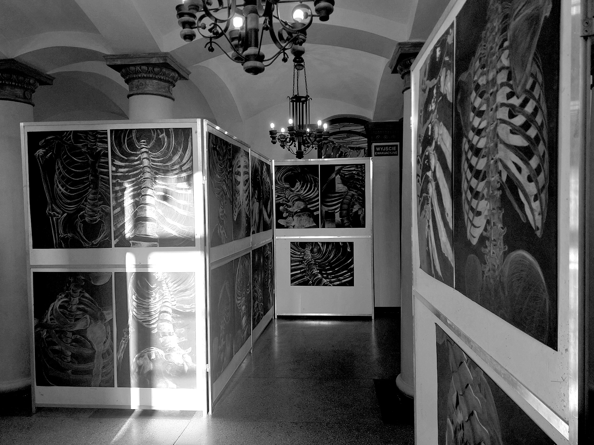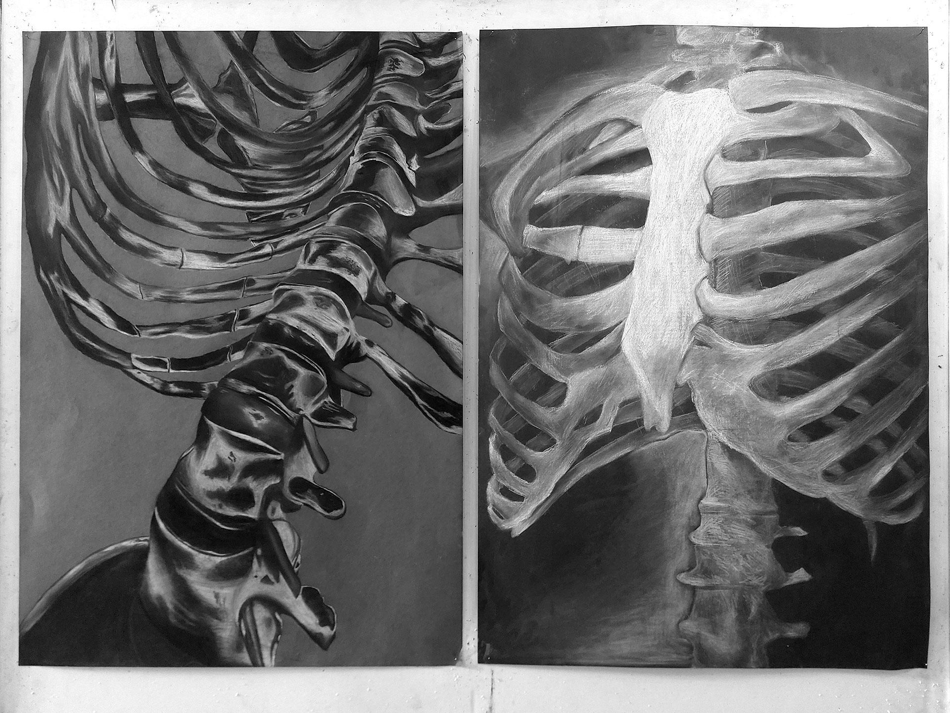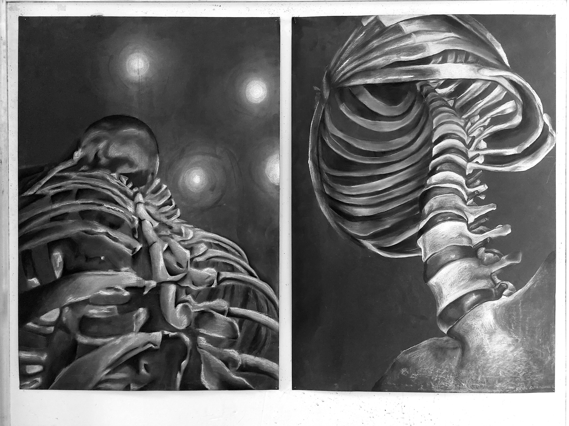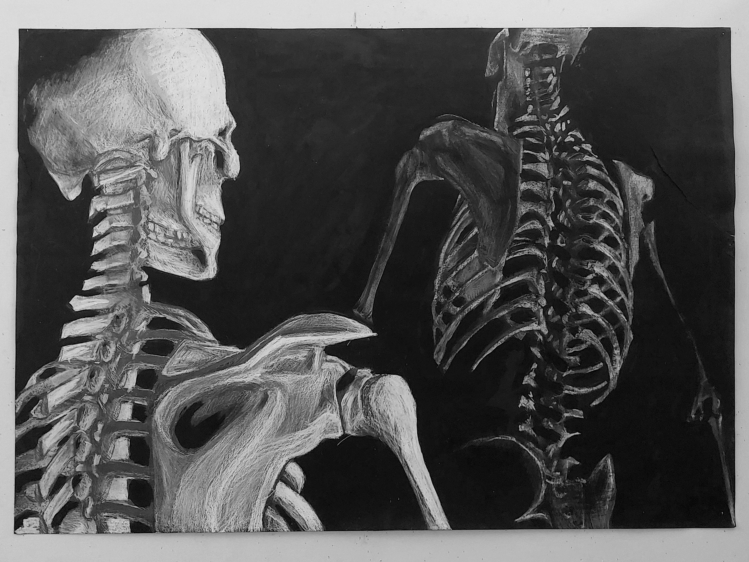 w którym zagadnienia związane z anatomią człowieka były omawiane na lekcji biologii, uczniowie podczas zajęć z rysunku i malarstwa mieli za zadanie poszukać interesujących rozwiązań plastycznych wykorzystując układ kostny człowieka. Dostępne w szkole modele anatomiczne służyły za materiał referencyjny. To zadanie stworzyło doskonałą okazję do wykorzystania zdobytej na lekcjach przedmiotu ogólnokształcącego wiedzy w ćwiczeniach praktycznych w pracowni rysunku i malarstwa.