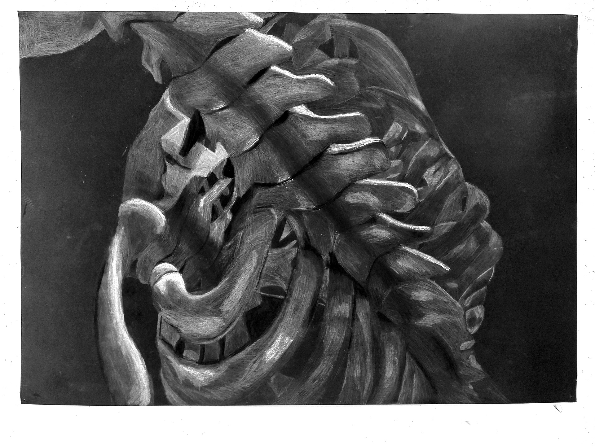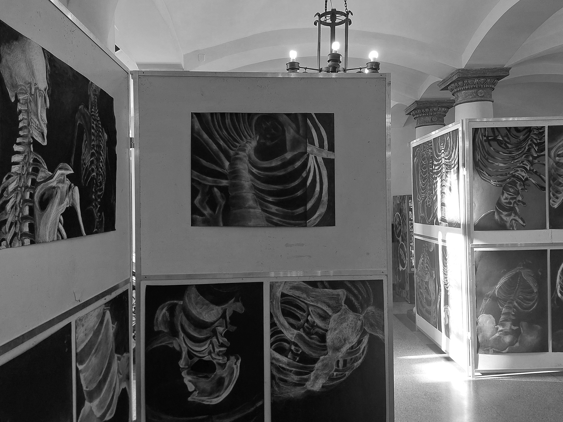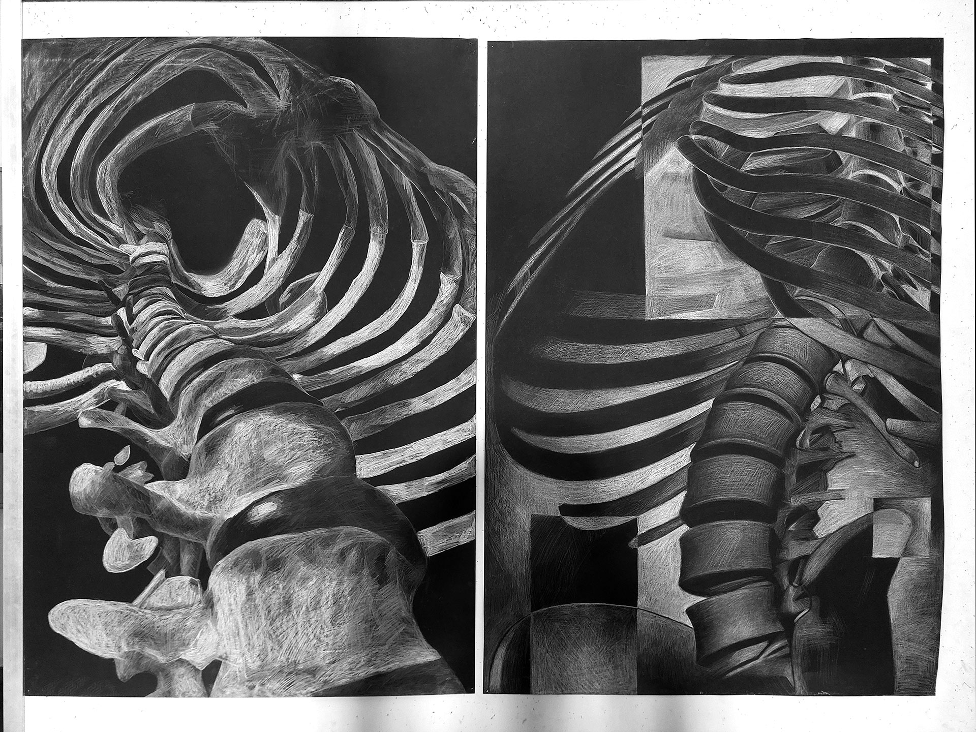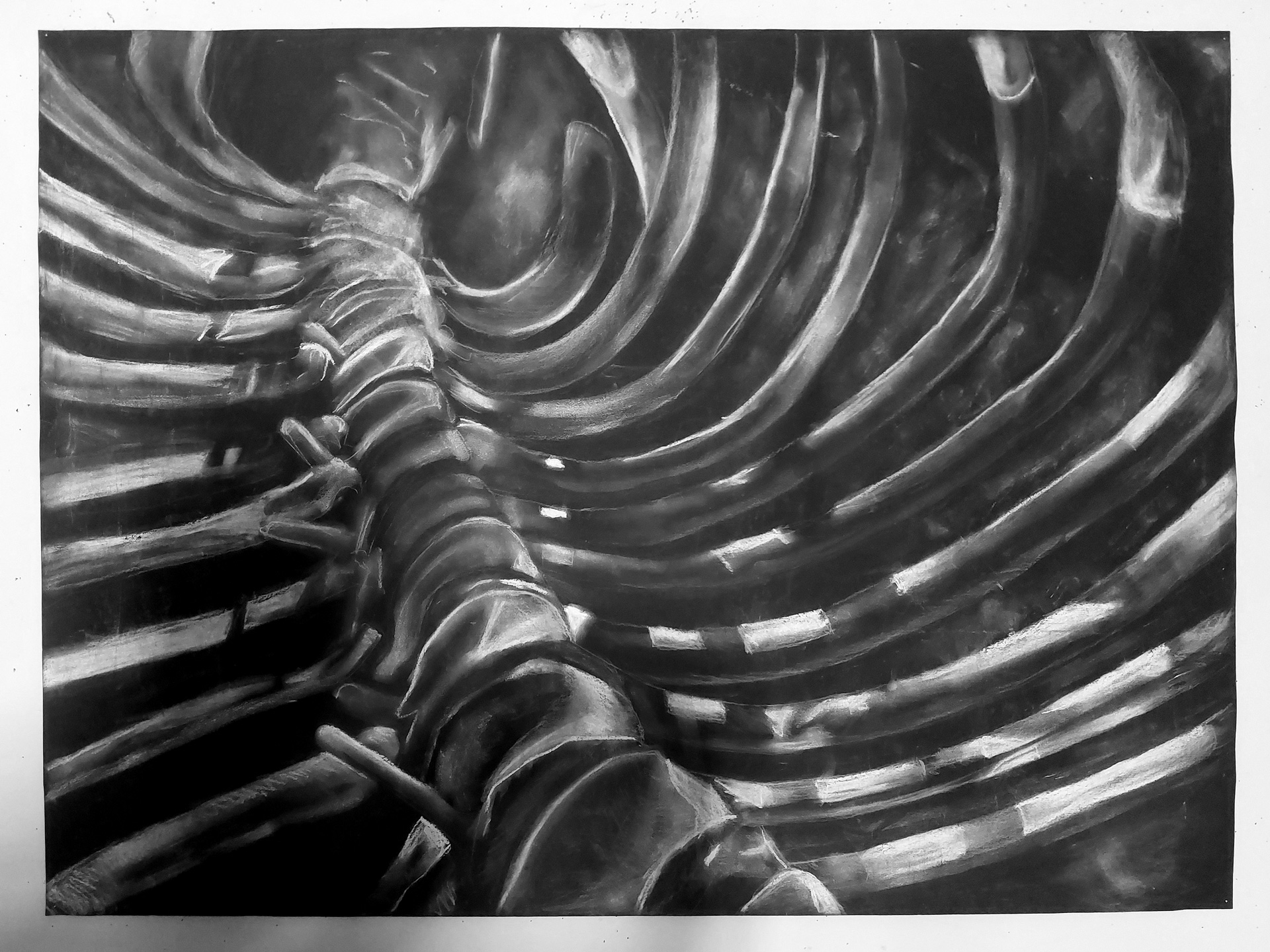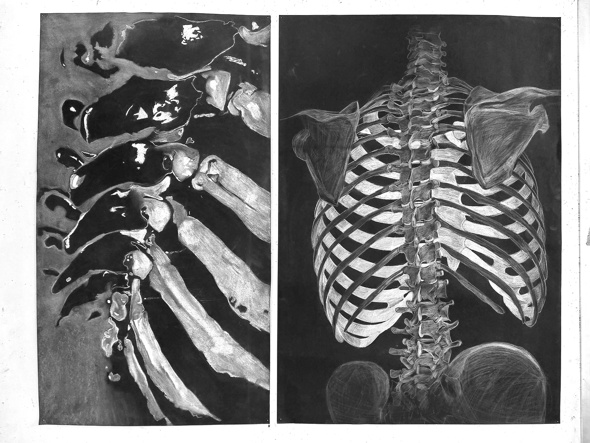 w którym zagadnienia związane z anatomią człowieka były omawiane na lekcji biologii, uczniowie podczas zajęć z rysunku i malarstwa mieli za zadanie poszukać interesujących rozwiązań plastycznych wykorzystując układ kostny człowieka. Dostępne w szkole modele anatomiczne służyły za materiał referencyjny. To zadanie stworzyło doskonałą okazję do wykorzystania zdobytej na lekcjach przedmiotu ogólnokształcącego wiedzy w ćwiczeniach praktycznych w pracowni rysunku i malarstwa.