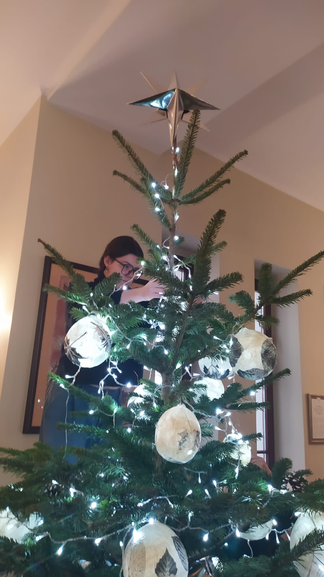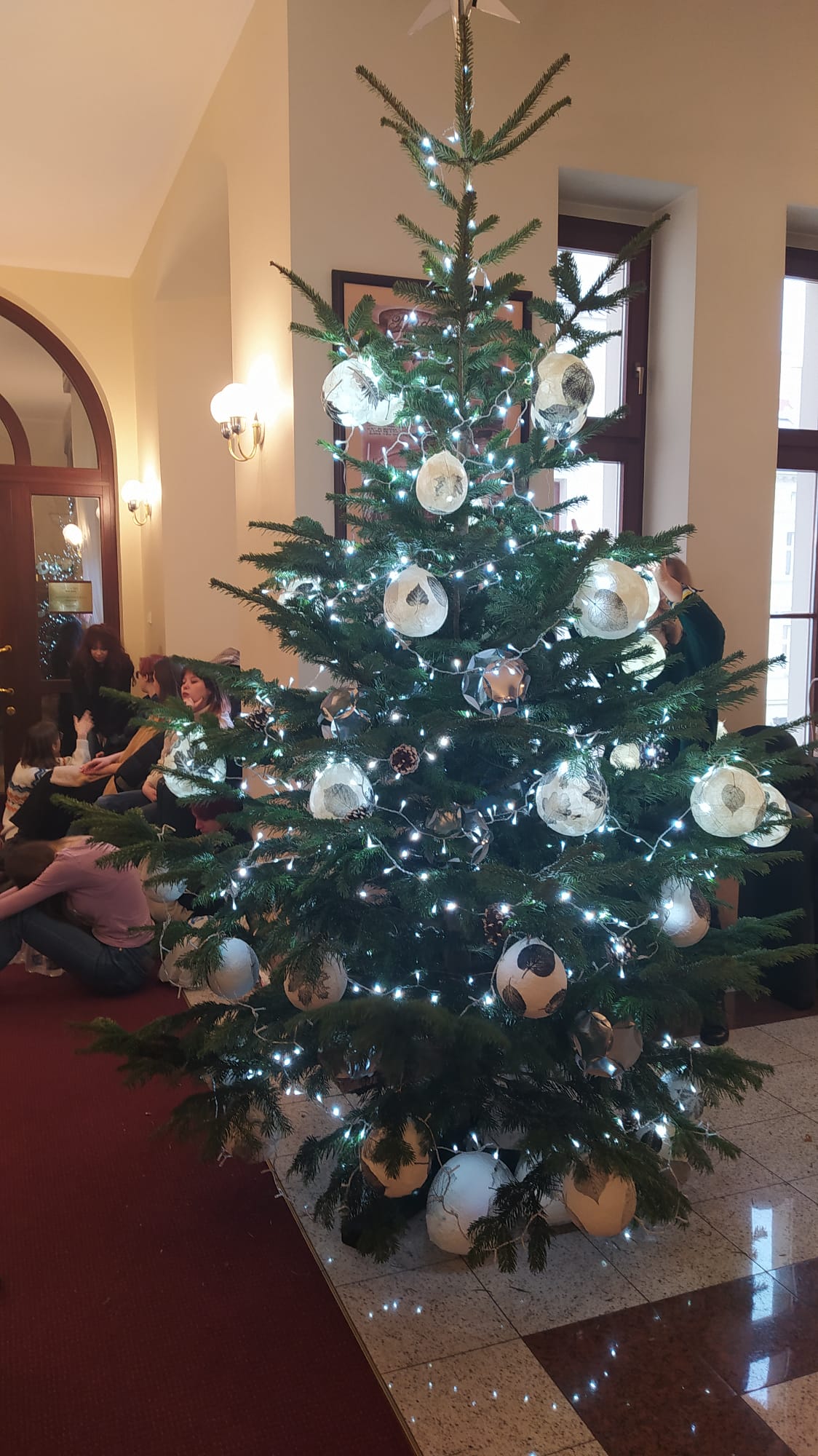 Ozdoby choinkowe w sposób bardzo misterny wcześniej zostały przygotowane na zajęciach specjalizacji. Imitacja kul śnieżnych z nadrukami prawdziwych liści wcześniej przygotowanych w pracowni graficznej zawisły na choince. Nadruk na każdym lampionie jest niepowtarzalny i stanowi unikatową formę. Rozproszone światło wewnątrz kul stanowi dodatkowy efekt wizualny. Uczniowie nasi wraz z nauczycielami oraz dyrekcją zostali bardzo miło przyjęci w Urzędzie Miejskim przez Prezydenta i pracowników.