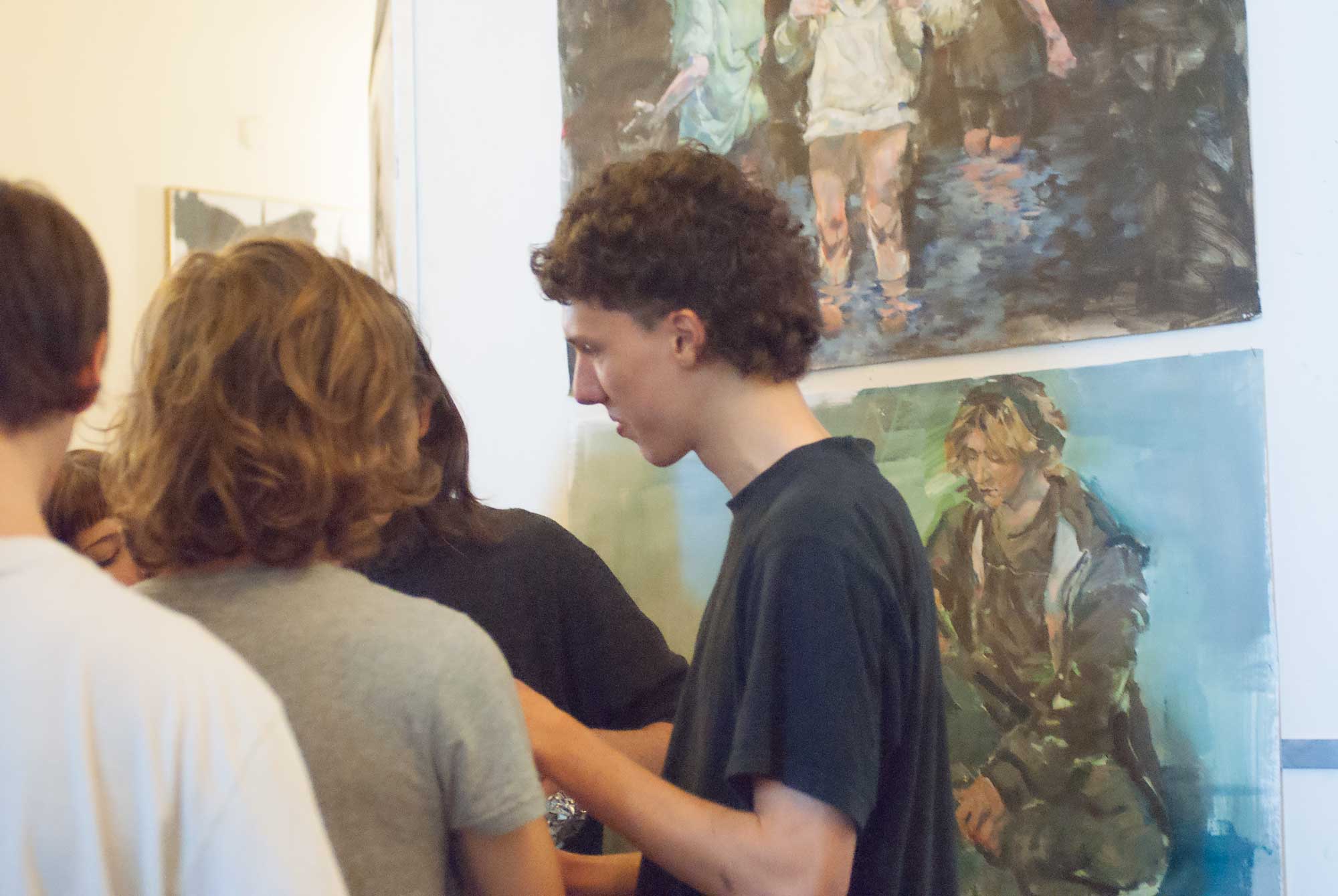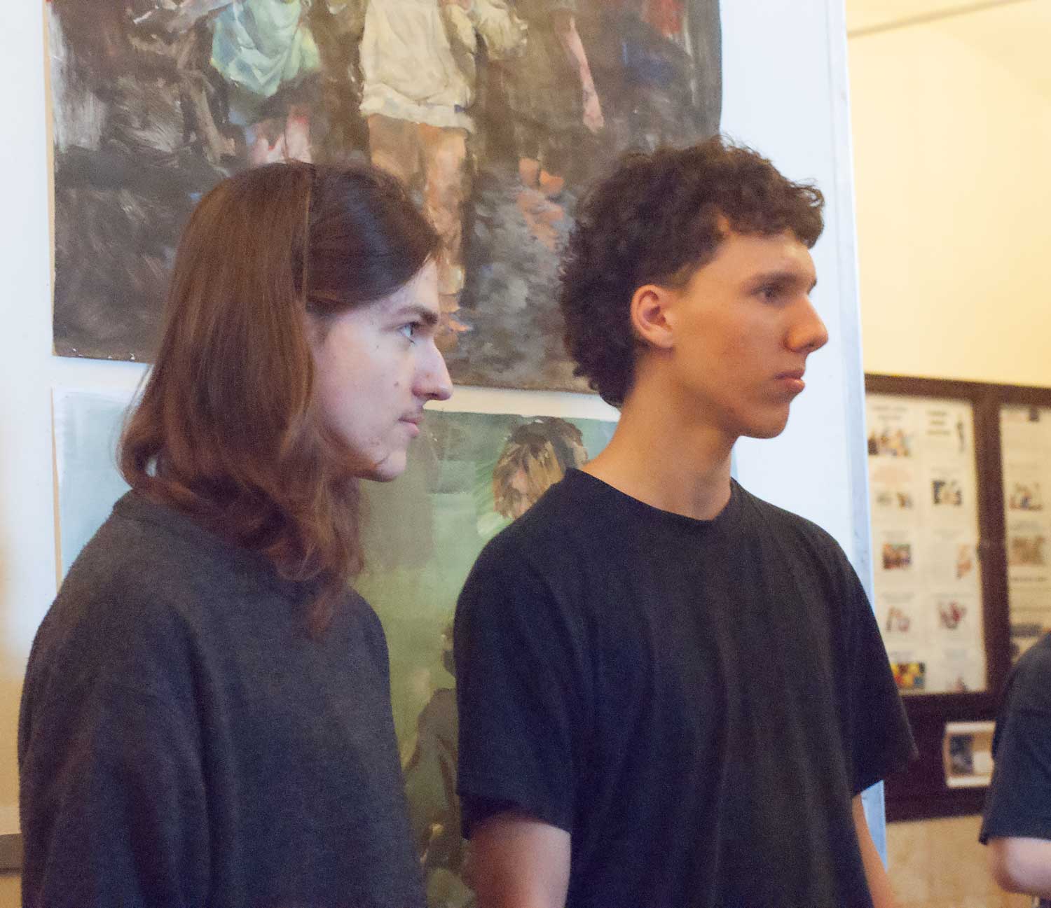 Po raz drugi swoje prace prezentuje duet uczniów, po ubiegłorocznych maturzystkach, Zuzannie Osadowskiej i Susannie Schwach tym razem Antoni Olszewski i Michał Pawłowski z klasy trzeciej. Prezentowane prace powstały w klasie drugiej w pracowni Sebastiana Tucholskiego. Mimo tak młodego wieku uczniów i niewielkiego jeszcze doświadczenia , trudno tym pracom odmówić dojrzałości i pewności wykonania. Antoni z dużą swobodą wyczuciem kolorystycznym i wrażliwością porusza się przede wszystkim w malarskiej materii. Odwaga i dbałość o detal są bardzo widoczne w budowaniu obrazu. Z niewiarygodną wręcz ekspresją oddaje świat natury. Czyste barwy i spójność kolorystyczna nadają pracom wyjątkowy charakter. Tematyka jest wynikiem wnikliwej obserwacji natury, co w połączeniu ze sprawnością manualną gwarantuje wysoki poziom prac. Oglądamy martwe natury, kompozycje figuralne z malarskim gestem wykonane pejzaże, portrety. Antoni sprawnie porusza się także w rysunku . Szuka ciekawych środków wyrazu artystycznego, eksperymentuje z narzędziami i formatami. Michał prezentuje prace malarskie, rysunki i rzeźbę . Jest wszechstronnie utalentowany i jak na tak młody wiek niezwykle profesjonalny w swoich pracach. Tematyka jest odzwierciedleniem obserwacji natury: sceny figuralne, martwe natury, człowiek i pejzaż. W tych wszystkich tematach widać ogromną wrażliwość, wnikliwość i radość z tworzenia. Malarstwo oprócz tytułowego gestu ma także swoistą patynę kolorystyczną . Stonowane barwy oddają pierwszeństwo wrażeniu i lekkości plamy. Obaj uczniowie są autentycznymi pasjonatami sztuki a szkoła nasza pozwala na realizację ich pasji. Życzymy Antoniemu i Michałowi jeszcze wielu ciekawych prac, oraz sukcesów w konkursach i wystawach, oraz wspaniałej artystycznej rywalizacji.