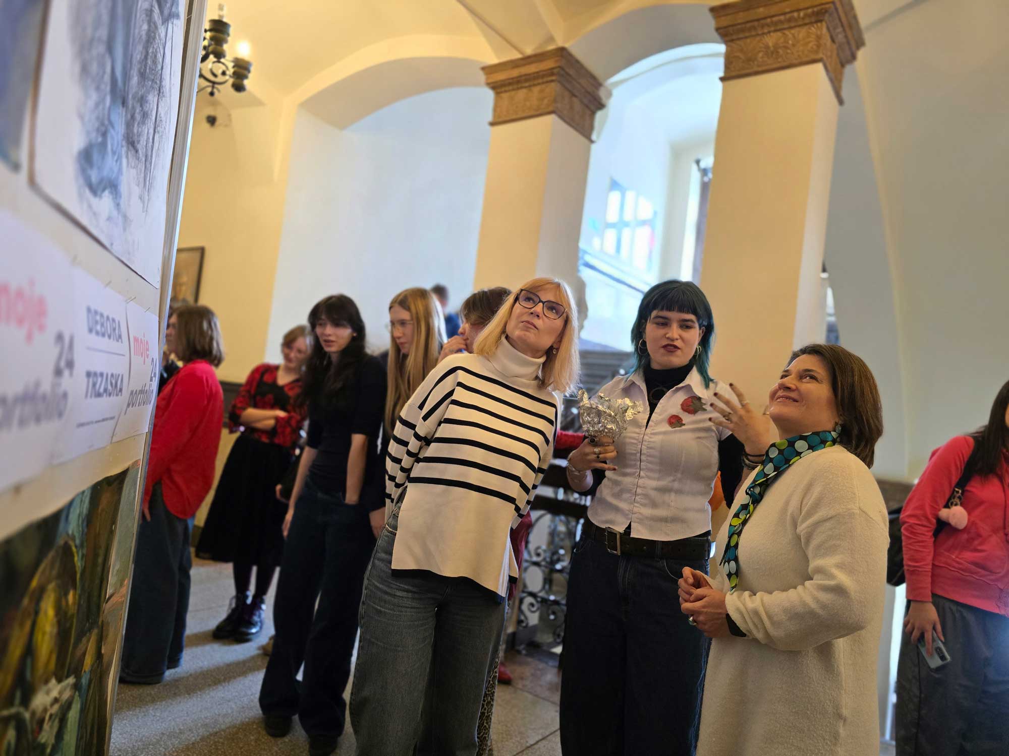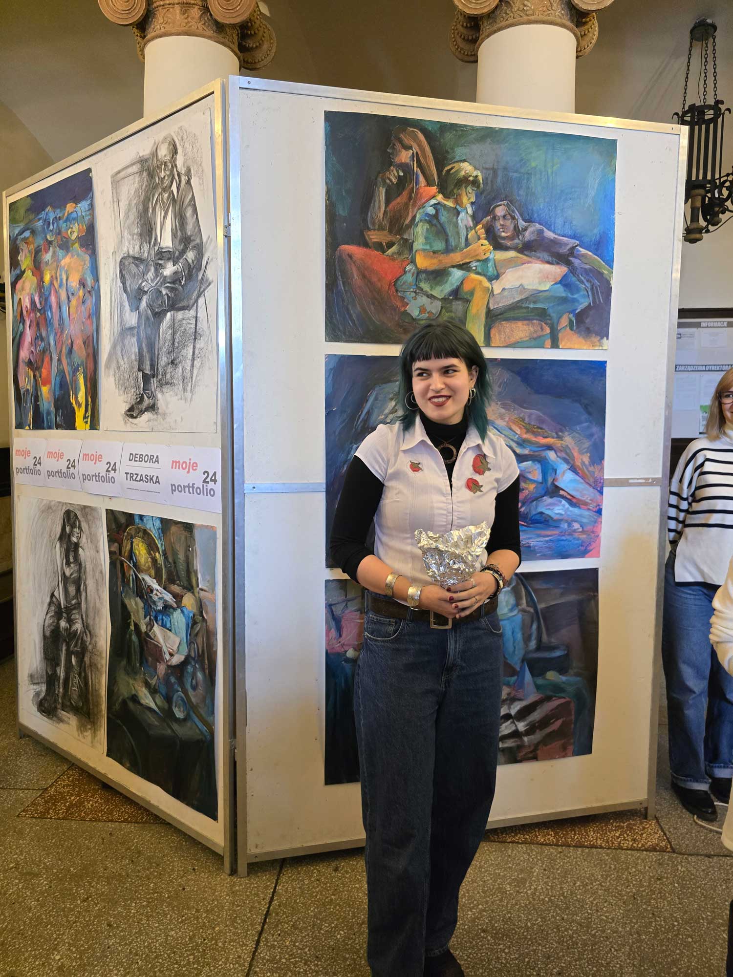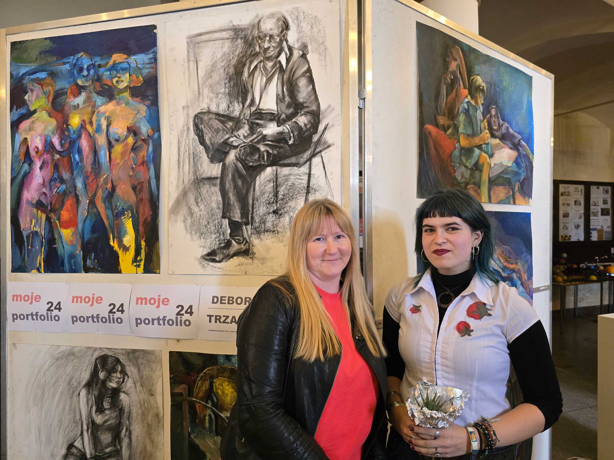 Autorka, Debora Trzaska jest obecnie uczennicą klasy IIIa. Prace które prezentuje powstały na przestrzeni ostatniego roku, w pracowni prof. Sebastiana Tucholskiego. Debora z dużą swobodą, wyczuciem kolorystycznym i wrażliwością porusza się przede wszystkim w malarskiej materii. Odwaga i temperament bardzo widoczne są w budowaniu malatury. Czysta kolorystyka podkreśla wrażliwość na barwy i ich temperatury. Autorka próbuje również dokonywać syntezy form, pewnych uproszczeń wynikających z gestu. Tematyka jest głownie wynikiem sprawnej obserwacji natury, co w połączeniu ze sprawnością manualną gwarantuje wysoki poziom prac. Debora doskonale realizuje się również w rysunku. Sprawnie porusza się w formie szkicu na dużym formacie. Martwe natury, kompozycje z wyobraźni, pierwsze próby portretowe, świadczą o kreatywnym podejściu autorki do pracy. Uczennica poszukuje i widać, że przynosi jej to wiele satysfakcji. We wszystkich formach wypowiedzi artystycznej czuje się komfortowo i są one bardzo spójne. Mamy nadzieję, że ta wystawa będzie początkiem wspaniałej artystycznej drogi i odkrywania jeszcze głębszych pokładów talentu i zainteresowań. Życzymy satysfakcji z wykonywanych prac i powodzenia w konkursach i wystawach.