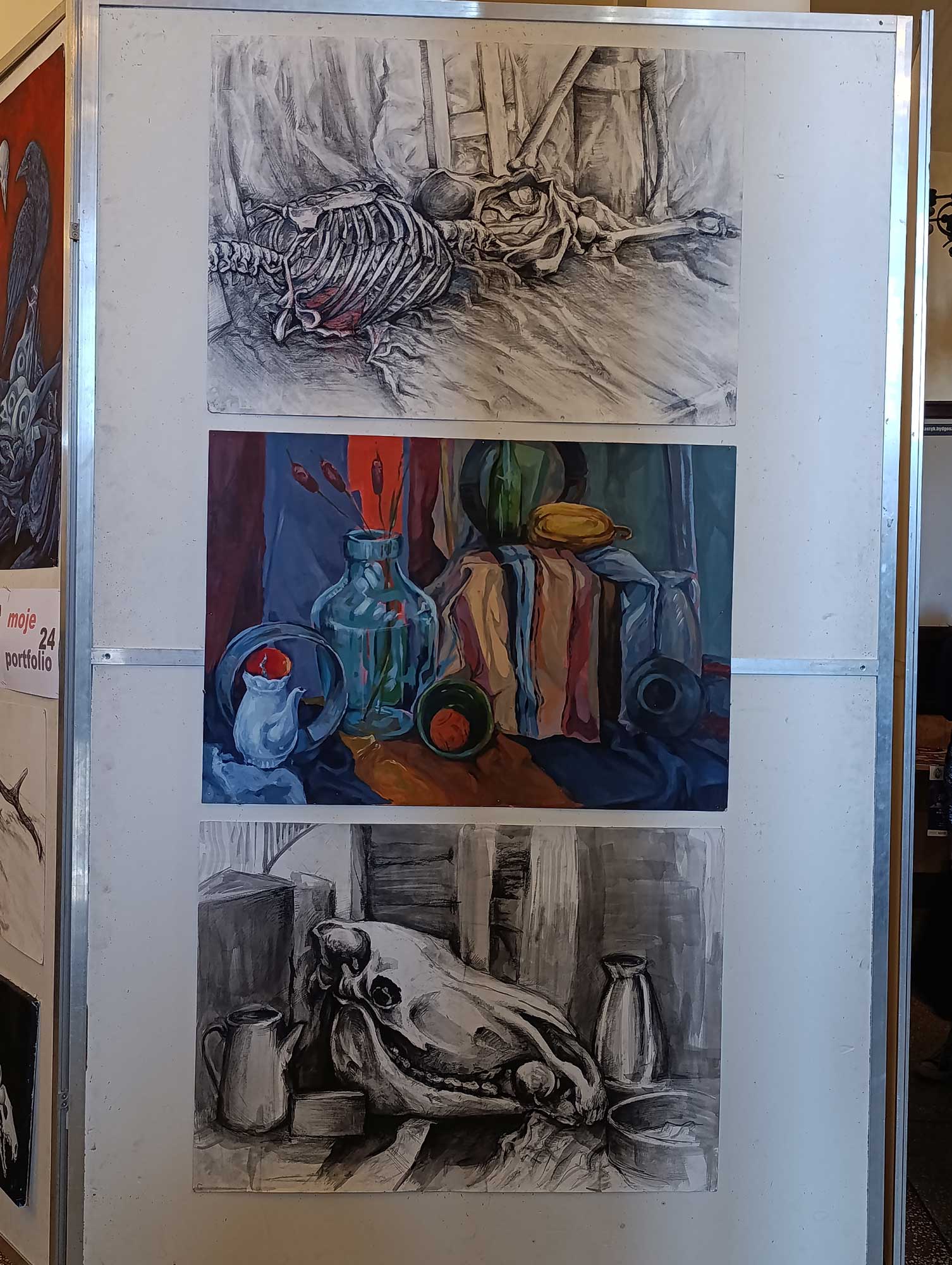 Prace, które prezentuje przenoszą nas w mistyczny świat natury, autorka wykonała na przestrzeni ostatnich dwóch lat, głównie w klasie trzeciej. Magda z dużą swobodą, wyczuciem kolorystycznym i wrażliwością porusza się zarówno w malarskiej jak i rysunkowej materii. Odwaga i dbałość o detal są bardzo widoczne w budowaniu obrazu. Z niewiarygodną wręcz precyzją wchodzi w świat natury. Czysta kolorystyka i duży potencjał nadają pracom wyjątkowy charakter. Tematyka jest głownie wynikiem sprawnej obserwacji natury, co w połączeniu ze sprawnością manualną gwarantuje wysoki poziom prac. Magda pokazuje oprócz malarstwa także prace rzeźbiarskie a dokładniej, koronkowe ornamenty wycinane w preparowanych czaszkach zwierząt. To co udaje się uczennicy wyczarować z kości zachwyca pomysłem i wykonaniem. Martwe natury, kompozycje, małe formy ilustratorskie mimo krótkiego stażu w szkole, świadczą o kreatywnym podejściu do pracy. Autorka poszukuje i widać, że każda technika przynosi jej wiele satysfakcji.