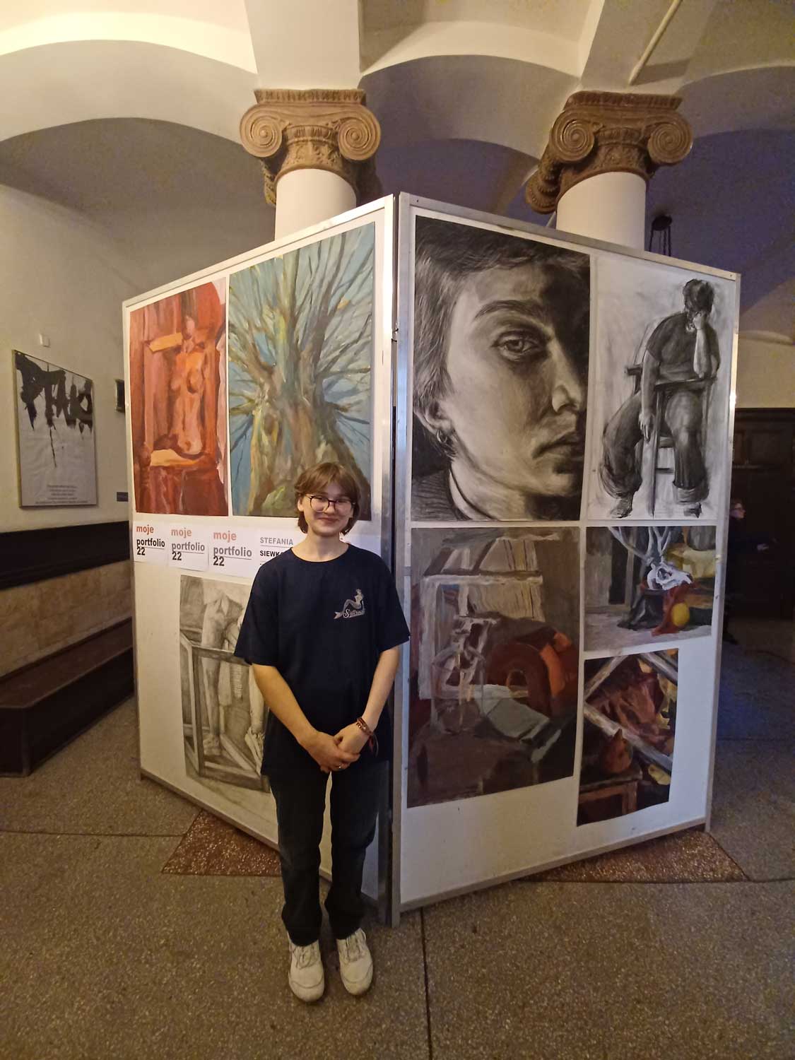 Autorka, Stefania Siewkowska jest obecnie uczennicą klasy IIIb. Prace które prezentuje powstały na przestrzeni ostatniego roku w klasie drugiej w pracowni prof. Sebastiana Tucholskiego. Stefania z dużą swobodą, wyczuciem kolorystycznym i wrażliwością porusza się przede wszystkim w malarskiej materii. Odwaga i temperament bardzo widoczne są w budowaniu malatury. Czysta kolorystyka podkreśla wrażliwość na barwy i ich temperatury. Tematyka jest głownie wynikiem sprawnej obserwacji natury, co w połączeniu ze sprawnością manualną gwarantuje wysoki poziom prac. Stefania doskonale realizuje się również w rysunku. Sprawnie porusza się w formie szkicu na dużym formacie. Martwe natury, kompozycje z wyobraźni, pierwsze próby portretowe, świadczą o kreatywnym podejściu autorki do pracy. Uczennica poszukuje i widać, że przynosi jej to wiele satysfakcji. We wszystkich formach wypowiedzi artystycznej czuje się komfortowo i są one bardzo spójne. Mamy nadzieję, że ta pierwsza wystawa będzie początkiem wspaniałej artystycznej drogi i odkrywania jeszcze głębszych pokładów talentu i zainteresowań. Życzymy satysfakcji z wykonywanych prac i powodzenia w konkursach i wystawach.