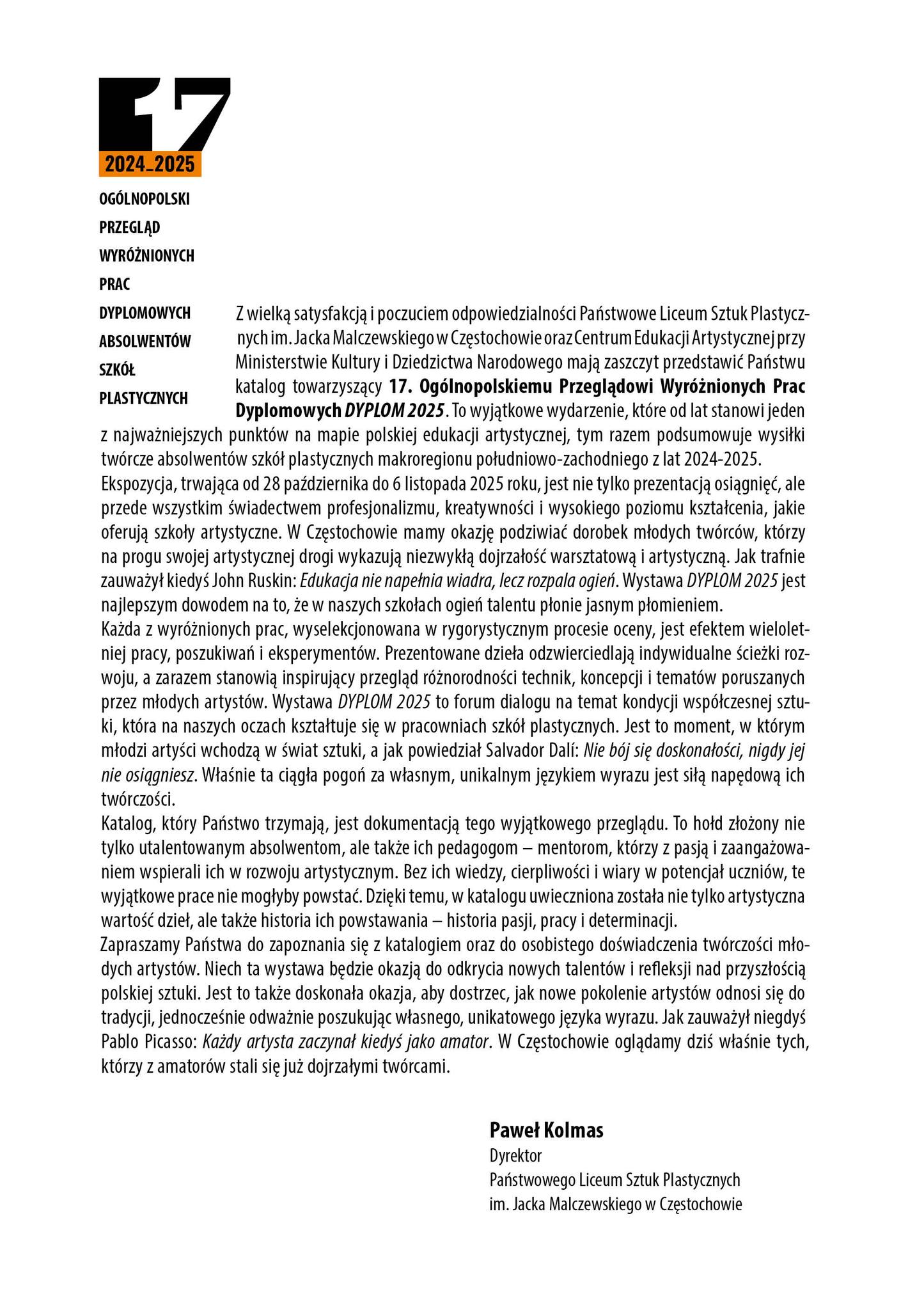 Zapraszamy Państwa do zapoznania się z katalogiem oraz do osobistego doświadczenia twórczości młodych artystów. Niech ta wystawa będzie okazją do odkrycia nowych talentów i refleksji nad przyszłością polskiej sztuki. Jest to także doskonała okazja, aby dostrzec, jak nowe pokolenie artystów odnosi się do tradycji, jednocześnie odważnie poszukując własnego, unikatowego języka wyrazu. Jak zauważył niegdyś Pablo Picasso: „Każdy artysta zaczynał kiedyś jako amator”. W Częstochowie oglądamy dziś właśnie tych, którzy z amatorów stali się już dojrzałymi twórcami.