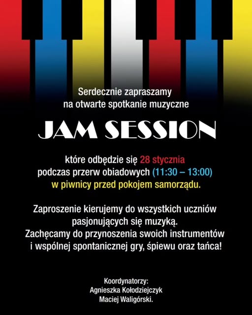 Serdecznie zapraszamy wszystkich uczniów pasjonujących się muzyką na otwarte spotkanie muzyczne pod nazwą JAM SESSION.