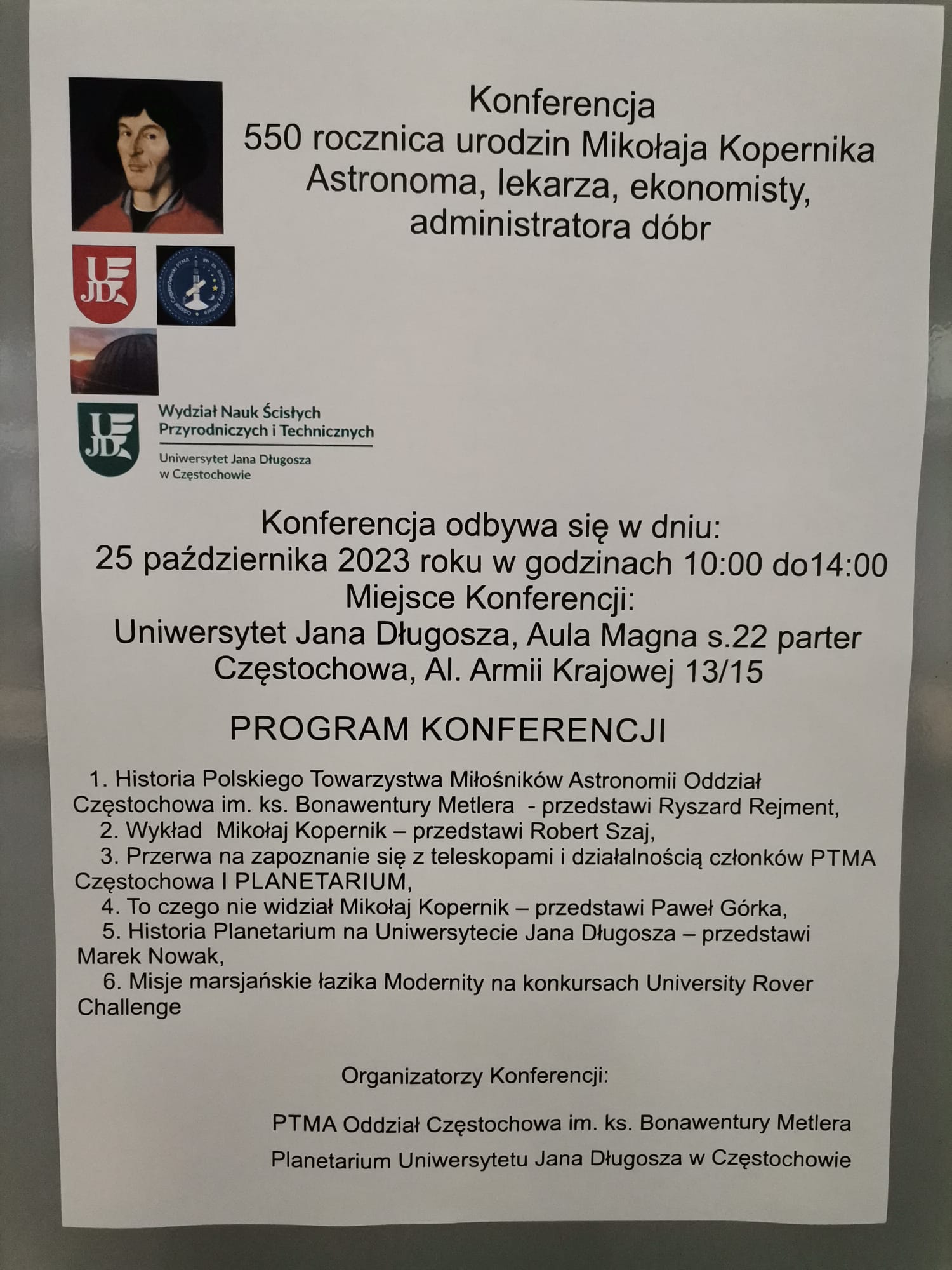 W dn. 25.X.2023 r. uczniowie kl. 1 g, pod opieką p. K. Kot oraz p. B. Jarosz, uczestniczyli w Konferencji z okazji 550 rocznicy urodzin M. Kopernika – astronoma, lekarza, ekonomisty. Uczniowie mieli okazję poszerzyć wiadomości z zakresu fizyki oraz zobaczyć oryginalny model łazika marsjańskiego. Skonstruowany przez studentów Politechniki częstochowskiej łazik marsjański był testowany na pustyni Utah, ponieważ sprostał wyzwaniom konkursowym w USA.