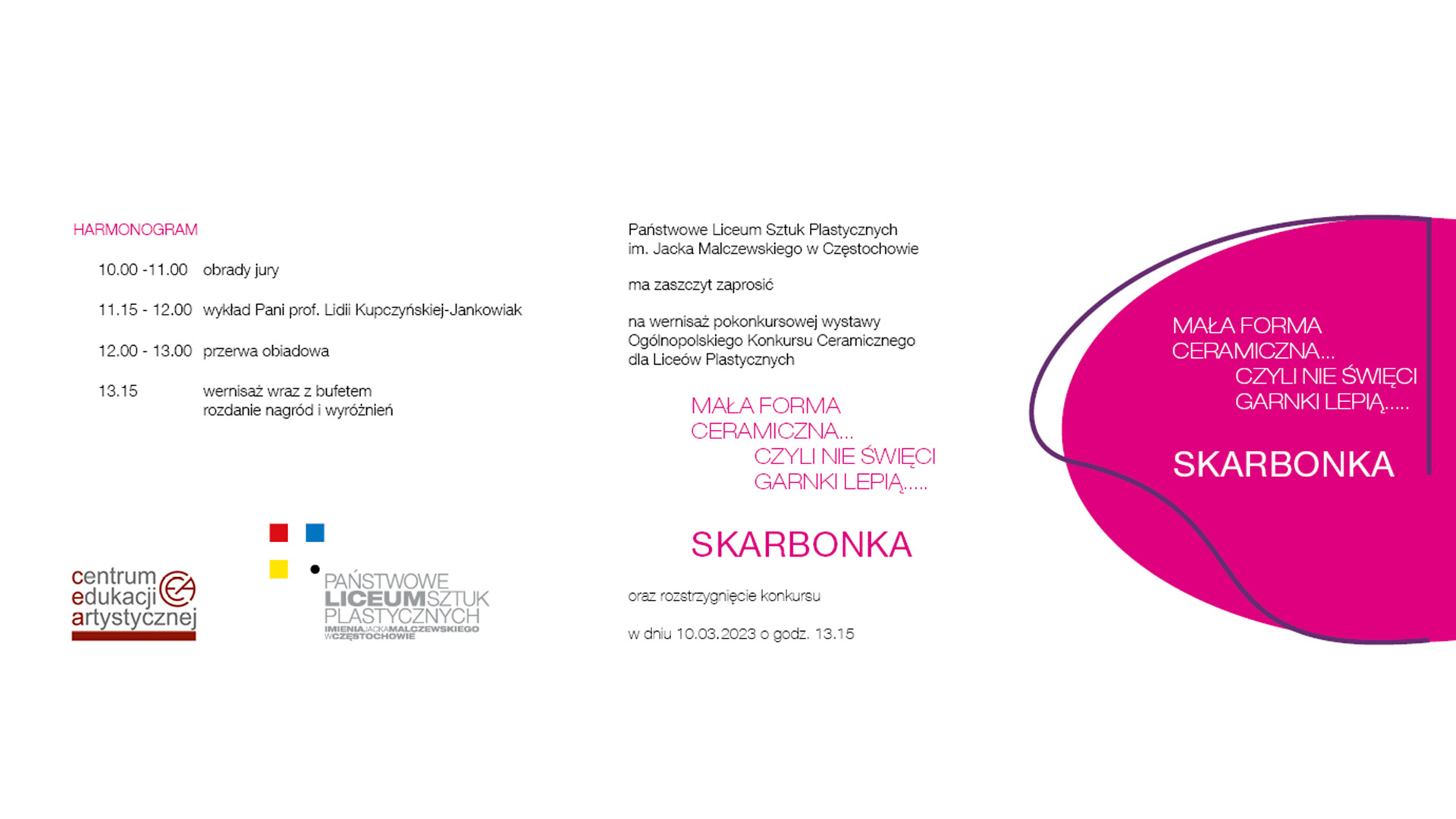 Państwowe Liceum Sztuk Plastycznych im. Jacka Malczewskiego w Częstochowie ma zaszczyt zaprosić na wernisaż pokonkursowej wystawy Ogólnopolskiego Konkursu Ceramicznego dla Liceów Plastycznych oraz rozstrzygnięcie konkursu w dniu 10.03.2023 o godz. 13.15.