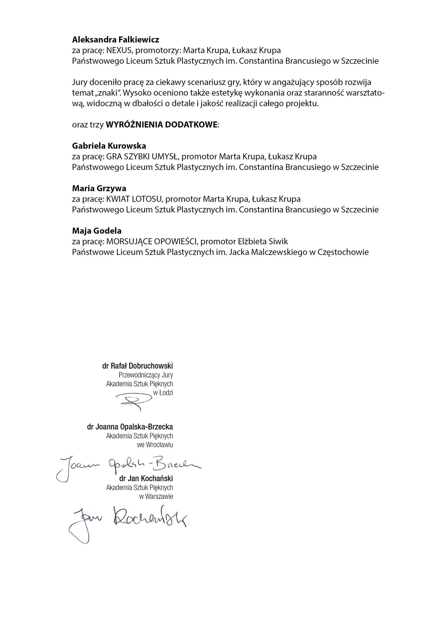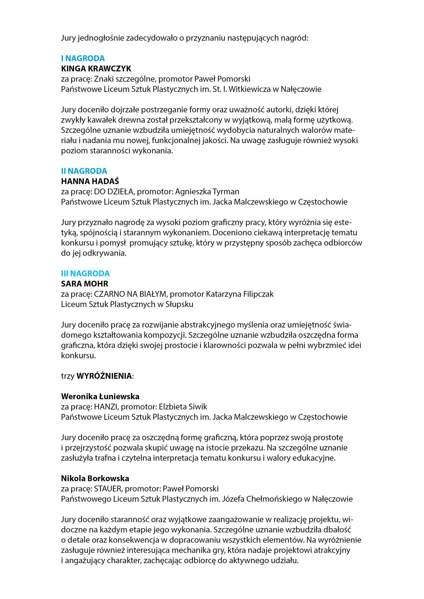 Oceny prac dokonało Jury w składzie: dr Rafał Dobruchowski – Dyrektor Instytutu Wzornictwa ASP w Łodzi, dr Joanna Opalska-Brzecka – Wydział Ceramiki i Szkła ASP we Wrocławiu oraz dr Jan Kochański – Wydział Architektury Wnętrz ASP w Warszawie. Podkreślamy, że prace Jury nad wyłonieniem laureatów miały charakter niezależny.