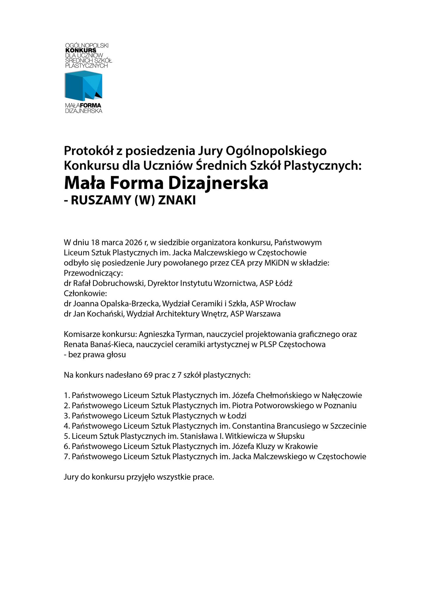 18 marca 2026 roku w Państwowym Liceum Sztuk Plastycznych im. Jacka Malczewskiego w Częstochowie odbyło się posiedzenie Jury Ogólnopolskiego Konkursu dla Uczniów Średnich Szkół Plastycznych „Mała Forma Dizajnerska – Ruszamy (w) znaki”. Na konkurs nadesłano 69 prac z 7 szkół plastycznych z całej Polski.