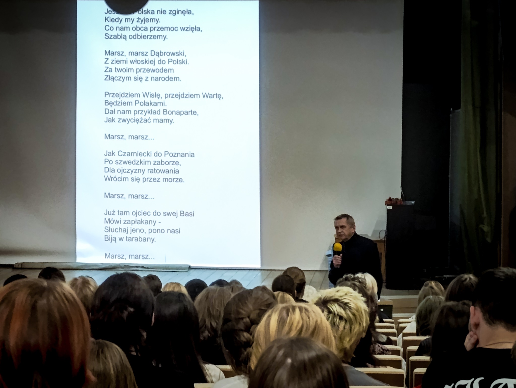 Uczniowie i nauczyciele wspólnie odśpiewali hymn narodowy, a następnie przypomniano najważniejsze wydarzenia historyczne, które doprowadziły do odzyskania wolności.