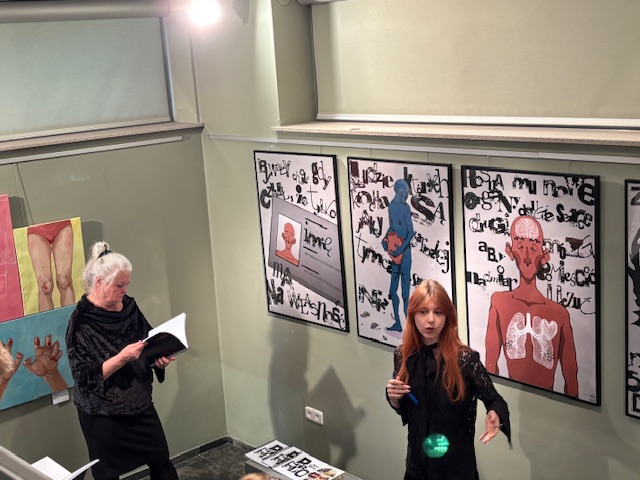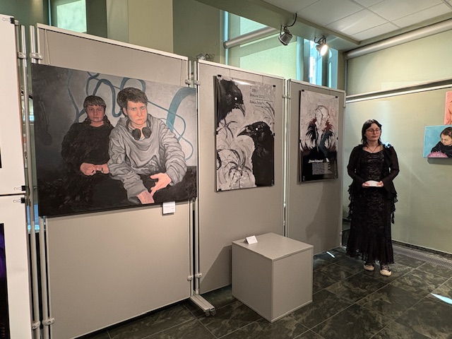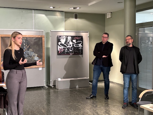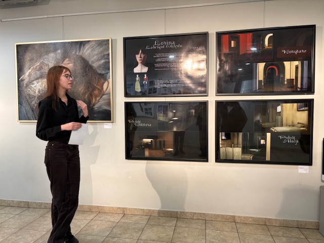 W Galerii pierwsze dyplomantki i dyplomant w czasie obrony swoich prac.