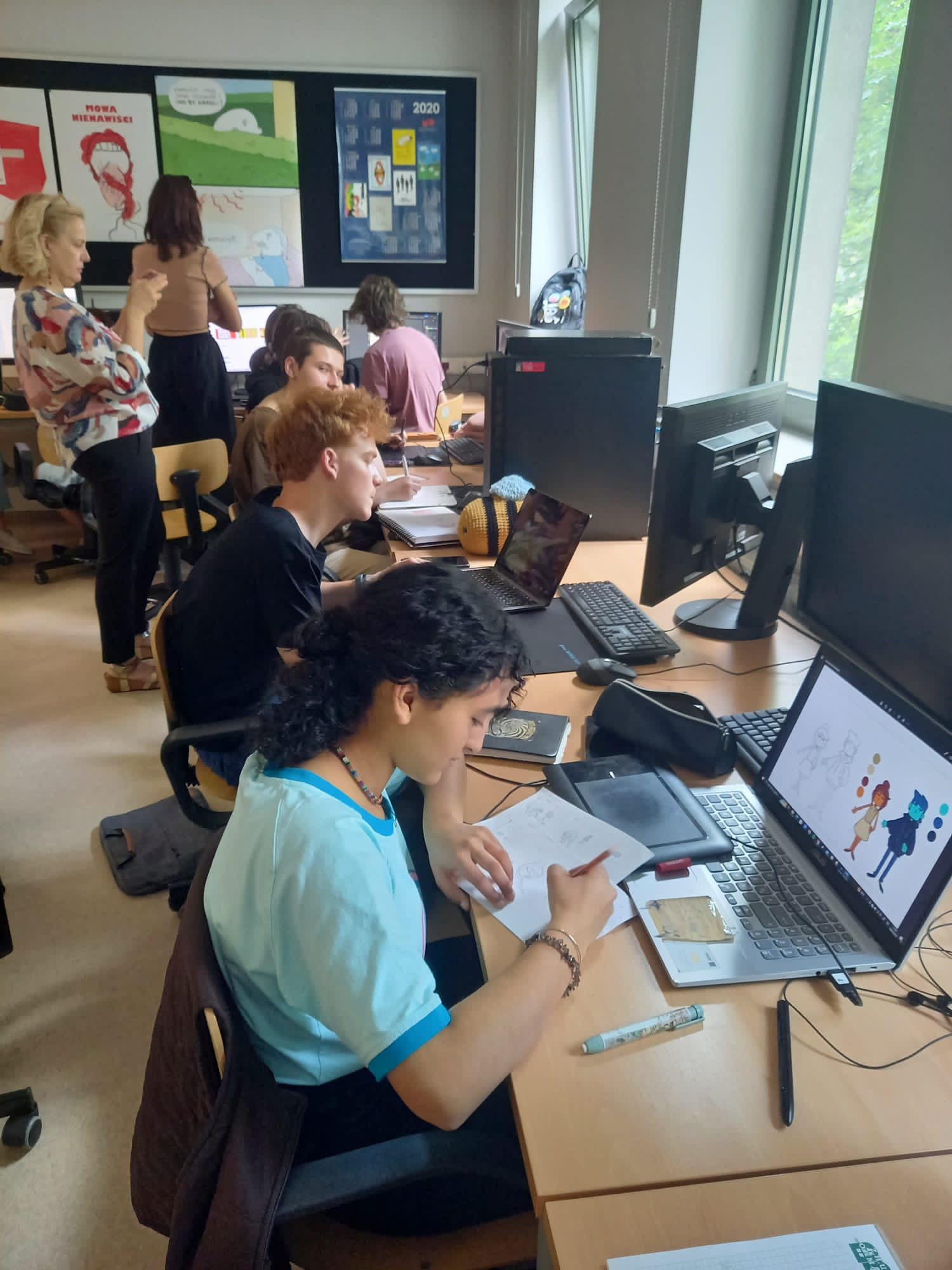 W maju w naszej szkole w ramach projektu Erasmus p.t."Media Education and DigComp for citizenship-students" przebywała młodzież ze szkół Włoskiej i Niemieckiej. W ramach projektu zrealizowano warsztaty graficzne przez uczniów klasy IIg Plastyka. W dniach 23 oraz 25 maja odbyły się zajęcia w pracowni jubilerskiej, poświęcone projektowaniu 3D. Celem tych zajęć było zapoznanie uczniów z podstawami obsługi programu Rhinoceros, popularnego narzędzia wykorzystywanego w przemyśle jubilerskim. Podczas trwania zajęć uczestnicy mieli możliwość zapoznania się z różnymi aspektami tego programu. Przedstawione zostały nie tylko podstawowe narzędzia, ale również ich funkcje, umożliwiające tworzenie prostych form biżuteryjnych.