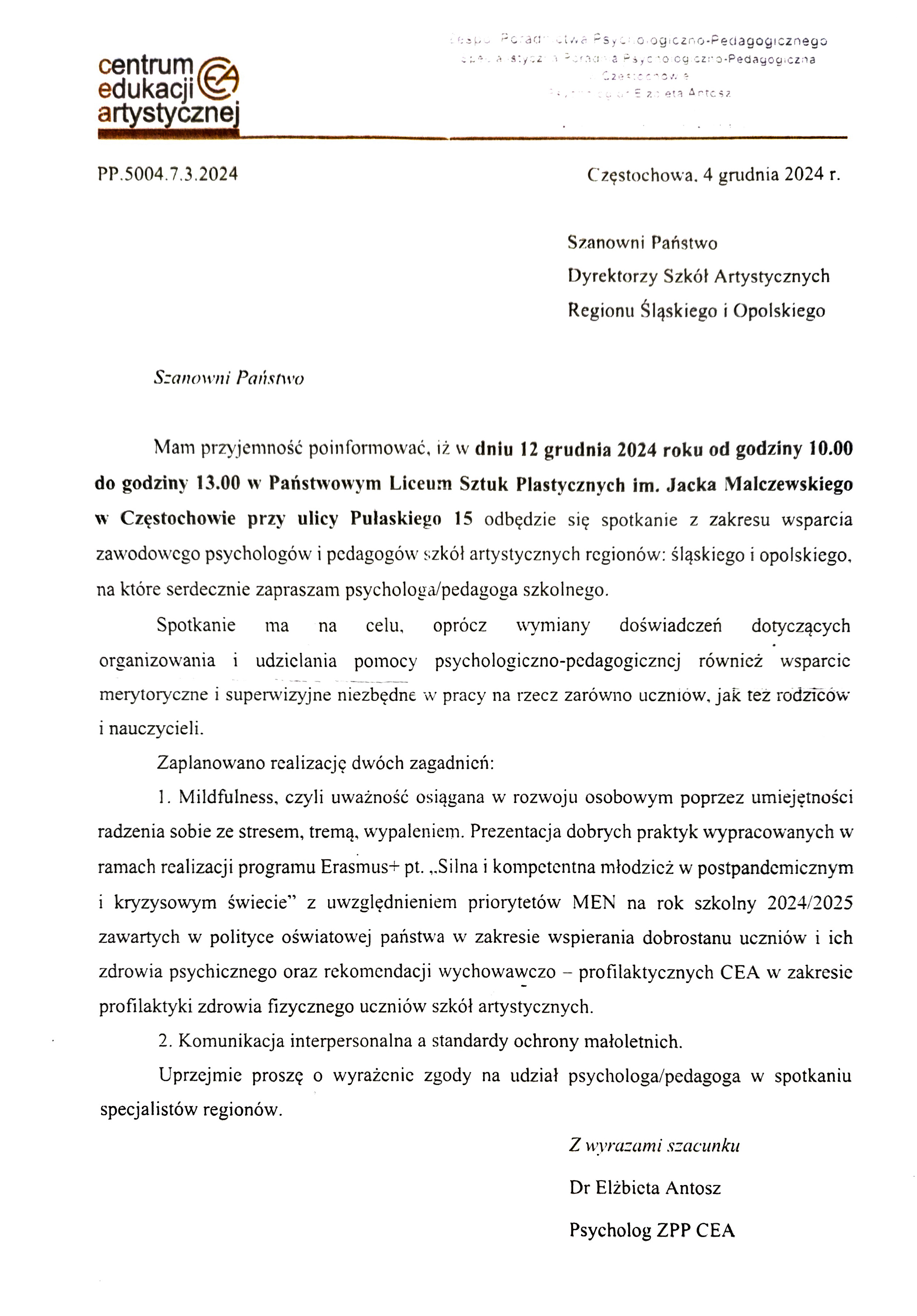 W Państwowym Liceum Sztuk Plastycznych im. Jacka Malczewskiego w Częstochowie odbyło się 12 grudnia br. spotkanie z zakresu wsparcia zawodowego psychologów i pedagogów szkół artystycznych regionów śląskiego i opolskiego. Gości przywitała i wprowadziła w temat konferencji wicedyrektor PLSP Pani Anna Maciejowska.
