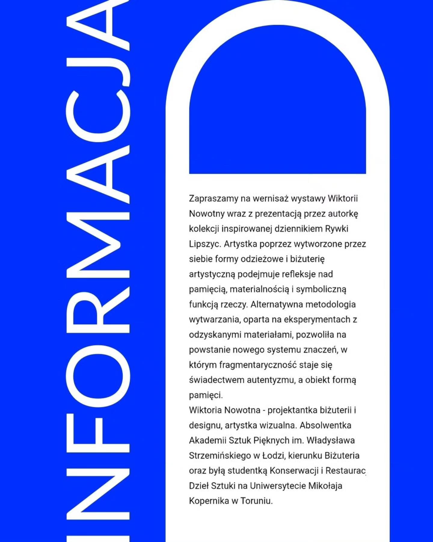 Wiktoria Nowotna - studentka Akademii Sztuk Pięknych im. Władysława Strzemińskiego w Łodzi., kierunek Biżuteria. W swojej pracy rozwija myśl projektową w dziedzinie biżuterii artystycznej łącząc zróżnicowane media.