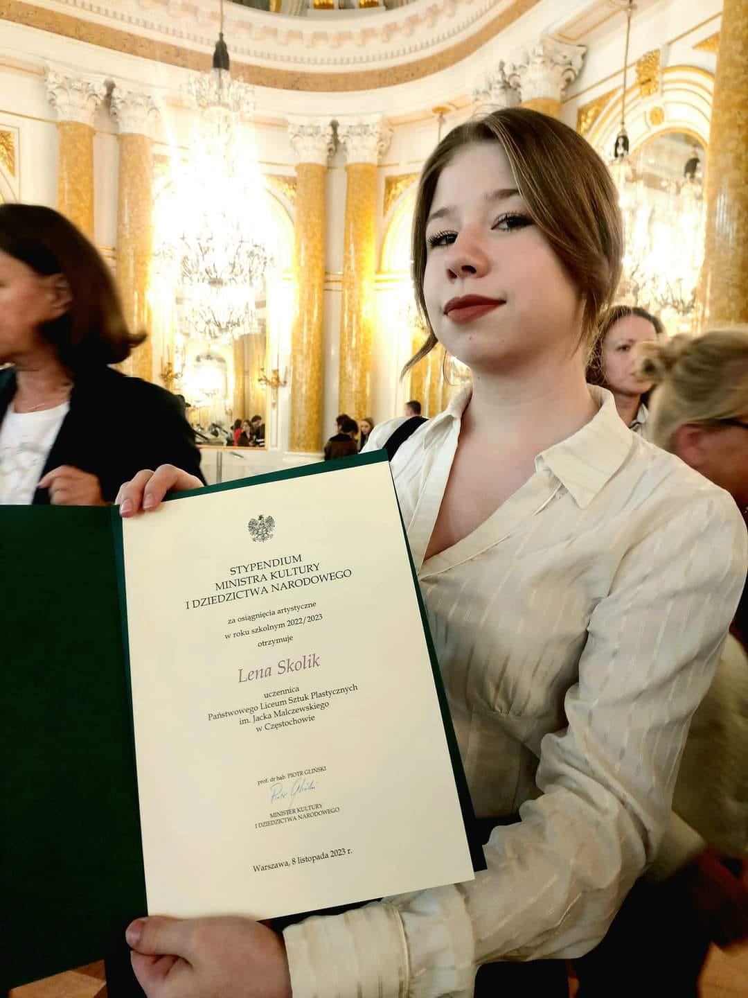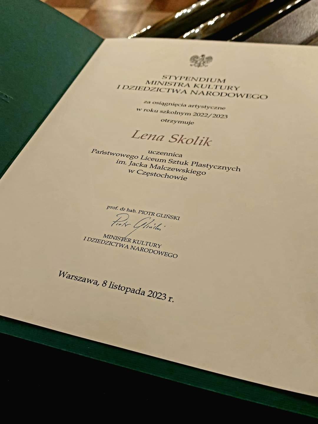 Dobra wiadomość z ostatniej chwili! Miło nam poinformować że Lena Skolik uczennica naszego Liceum otrzymała w dniu dzisiejszym Stypendium Ministra Kultury i Dziedzictwa Narodowego za osiągnięcia artystyczne w roku szkolnym 2022 / 2023