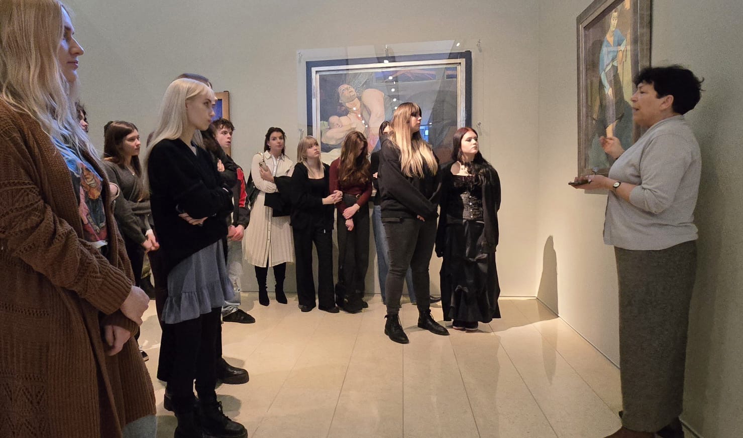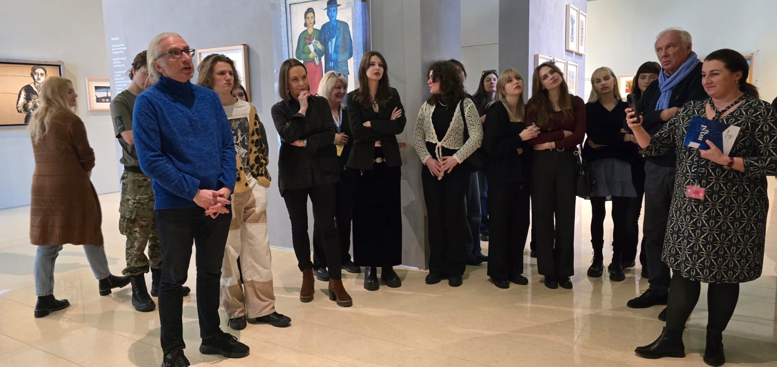 Przywitano nas szczególnie serdecznie. Pani Wiesława Giedrojć zaprosiła uczniów i nauczycieli na wystawę malarstwa Andrzeja Wróblewskiego. To wielkie wrażenie móc oglądać, a jednocześnie słuchać opowiadającej z wielka pasją pani Romualdy Radwańskiej, wyjaśniającej kulisy życia autora prac, jego sztuki, a także historię, w której żył autor kilkudziesięciu prac wystawionych w Sali wystawowej Fundacji Rodziny Staraków. To oprowadzenie było przyczynkiem do wspólnych wzruszeń, które podkreśliły wiersze Tadeusza Różewicza czytane przez prof. Łukasza Laskowskiego.