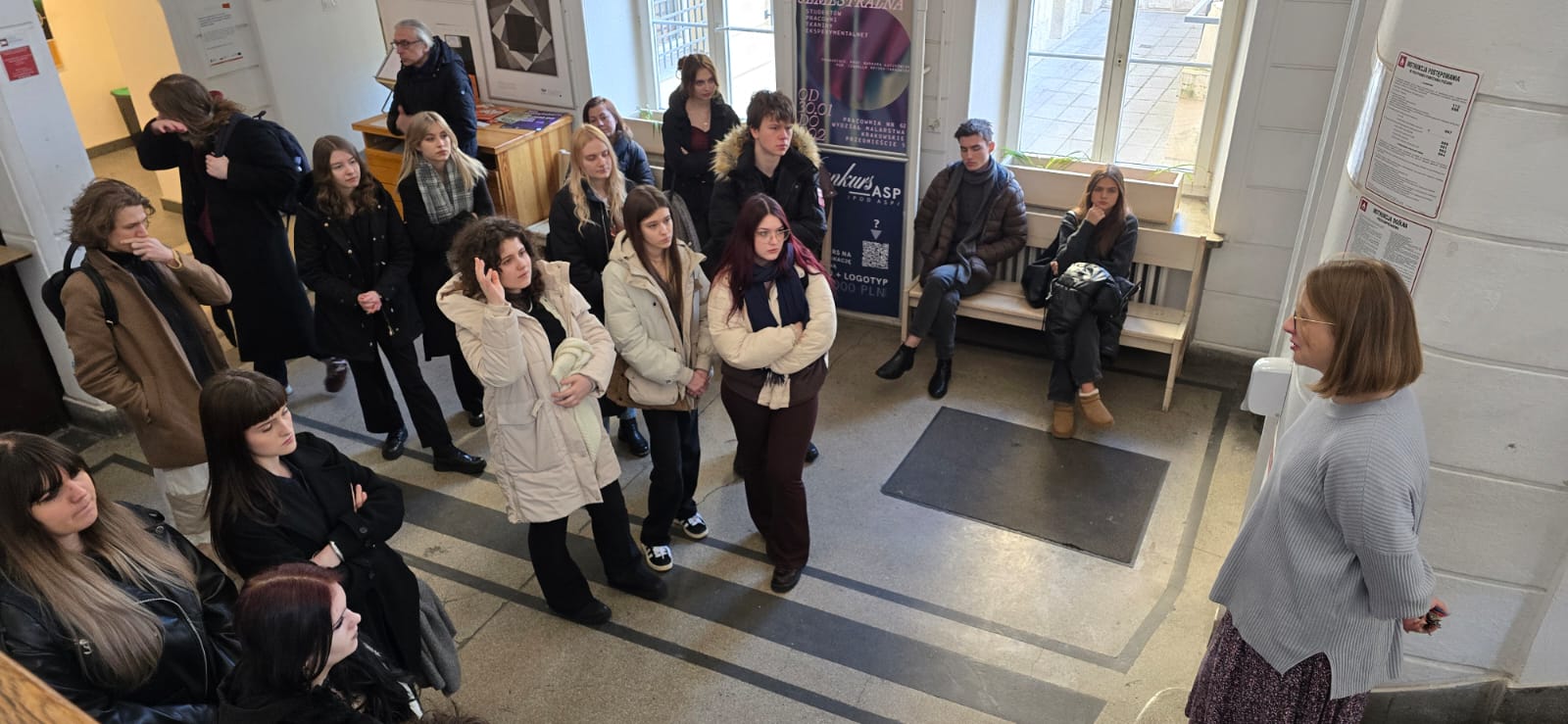 Zwiedzanie rozpoczęto od wizyty w Akademii Sztuk Pięknych na Wydziale Malarstwa. Tutaj, dzięki Pani prodziekan, która poświęcając specjalnie czas, zapoznała uczestników z historią wydziału. Wszyscy zwiedzili sale gdzie prowadzone są zajęcia kierunkowe. Uczniowie dowiedzieli się także jak prowadzone są zajęcia, ale także jakie warunki trzeba spełnić aby zostać studentem wydziału malarstwa. Oprowadzała i udzielała szczegółowych wyjaśnień pani prodziekan dr. Katarzyna Dyjewska.
