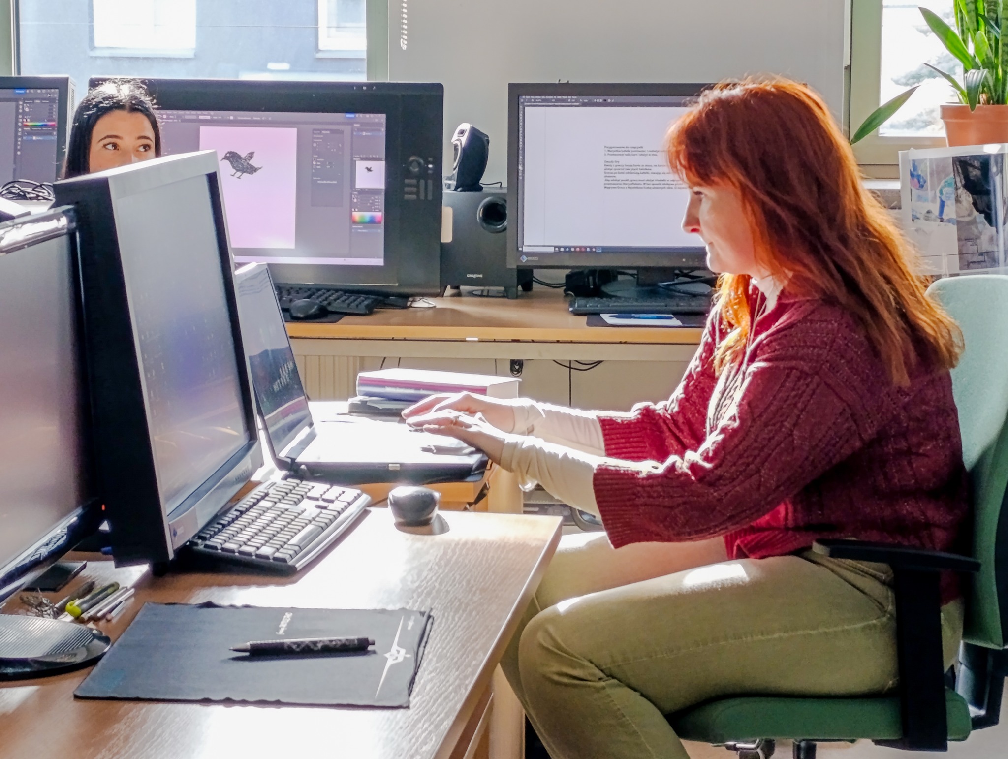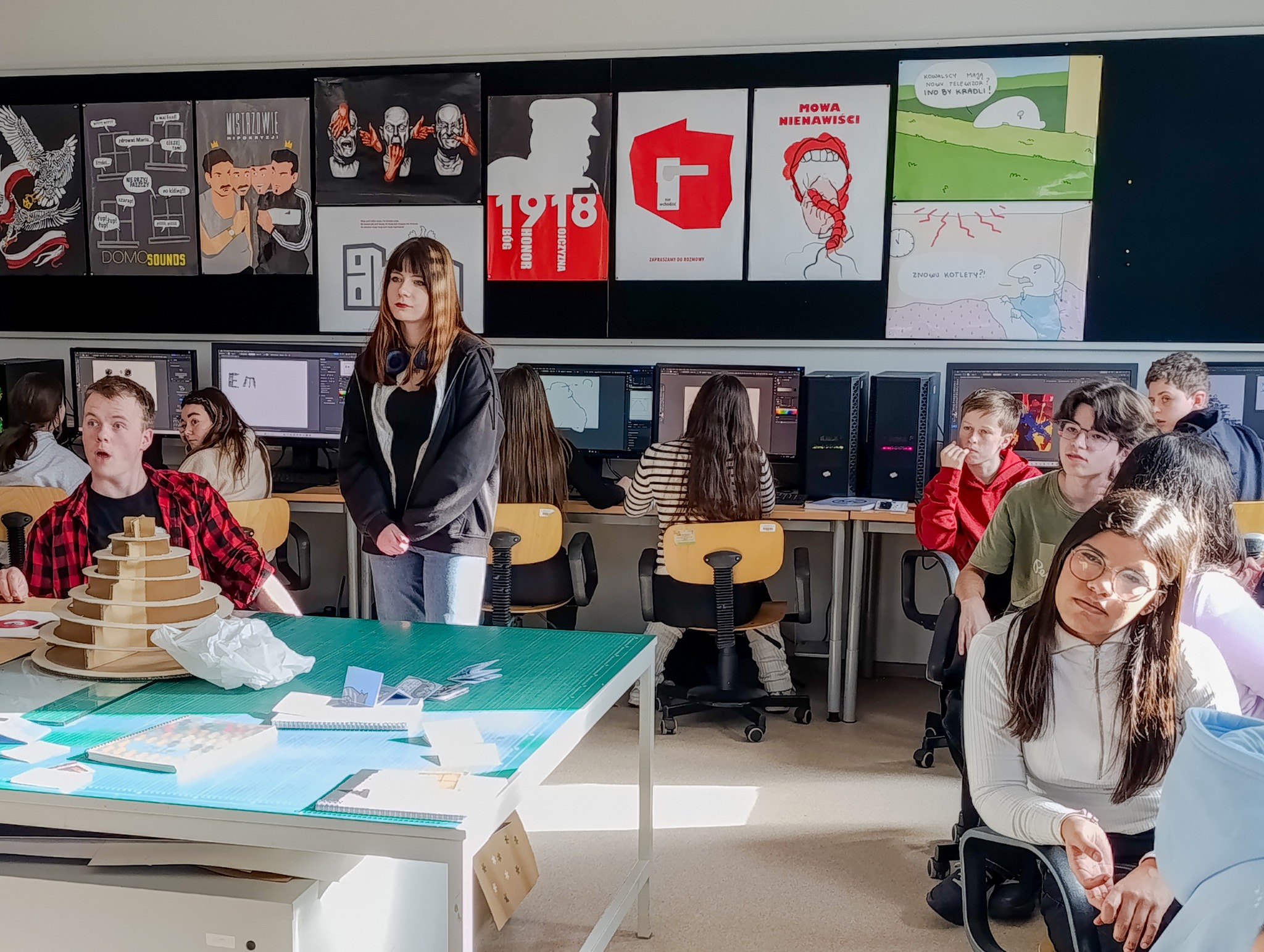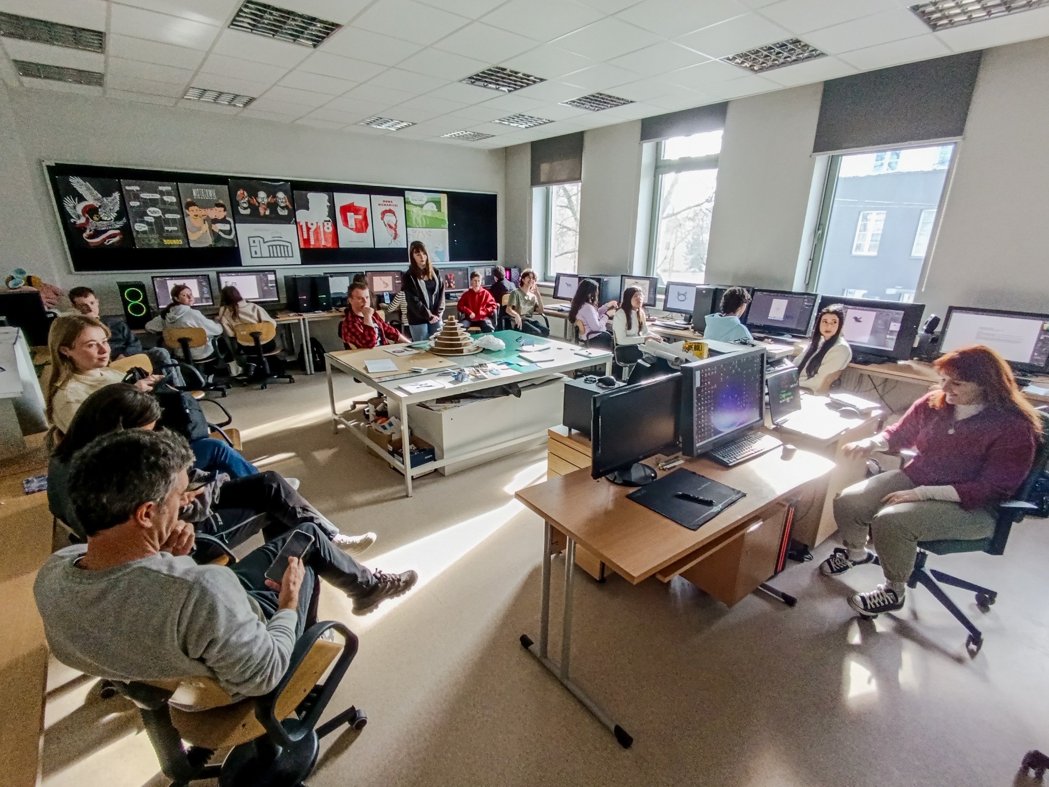 Wspólne ćwiczenia, szybkie decyzje projektowe i – dla rozluźnienia – autorska gra komputerowa! To wszystko podczas spotkania w pracowni Projektowania Graficznego i Multimediów.