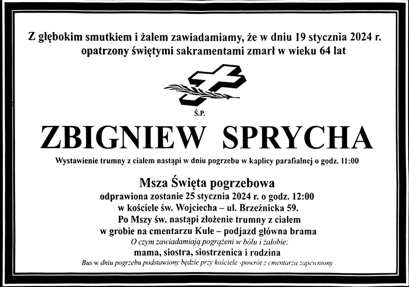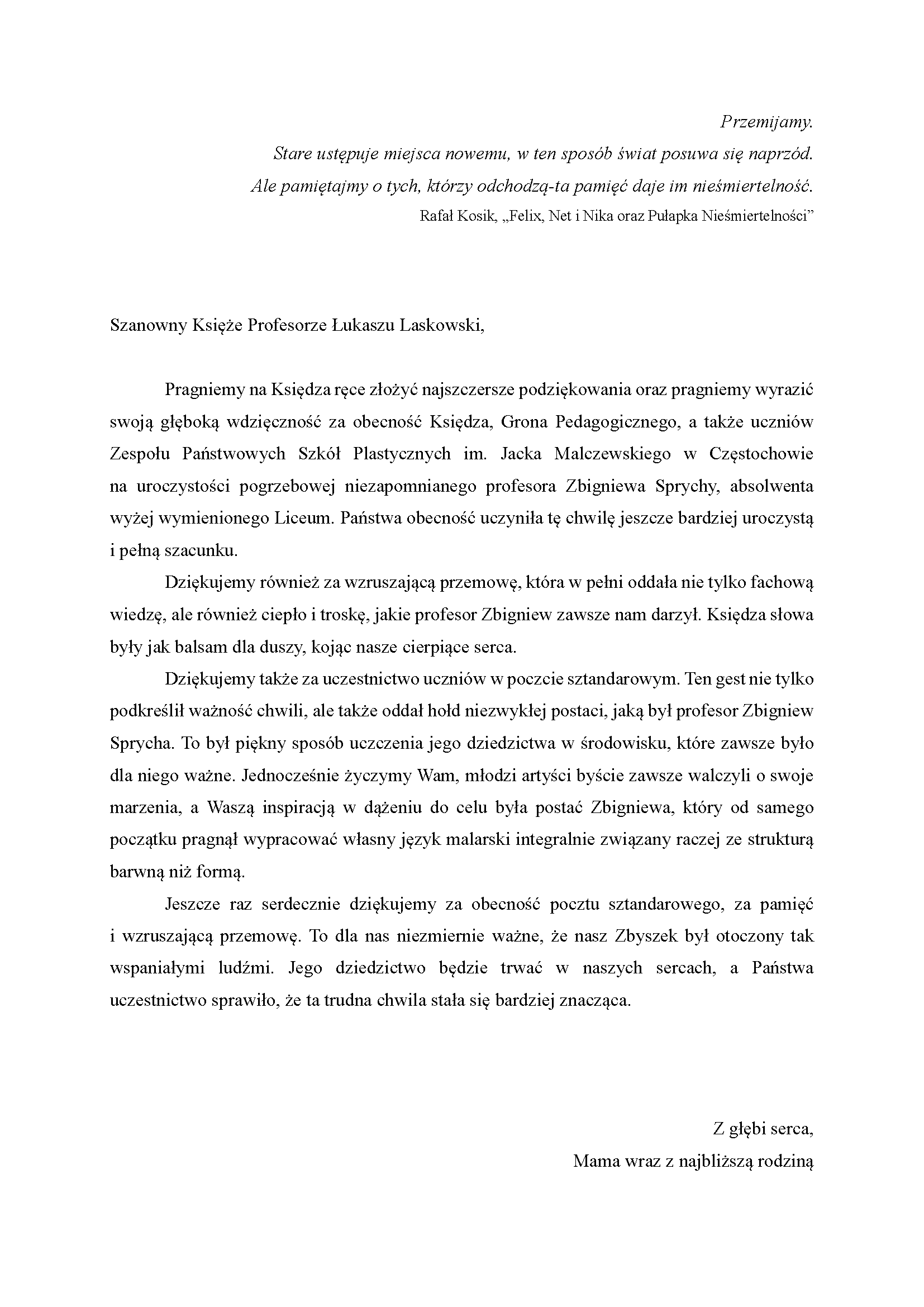 swoją głęboką wdzięczność za obecność Księdza, Grona Pedagogicznego, a także uczniów Państwowego Liceum Sztuk Plastycznych im. Jacka Malczewskiego w Częstochowie na uroczystości pogrzebowej niezapomnianego profesora Zbigniewa Sprychy, absolwenta wyżej wymienionego Liceum. Państwa obecność uczyniła tę chwilę jeszcze bardziej uroczystąi pełną szacunku.