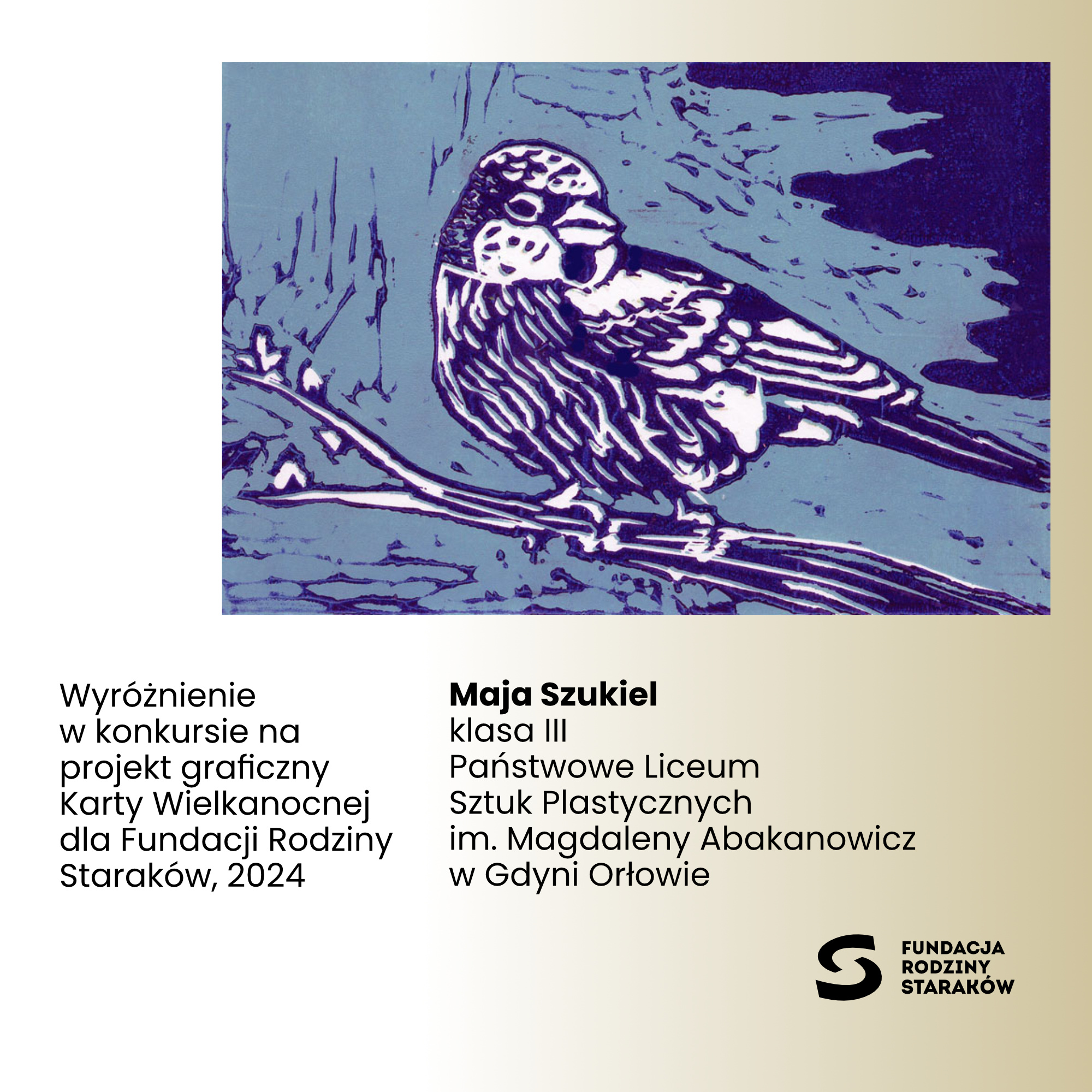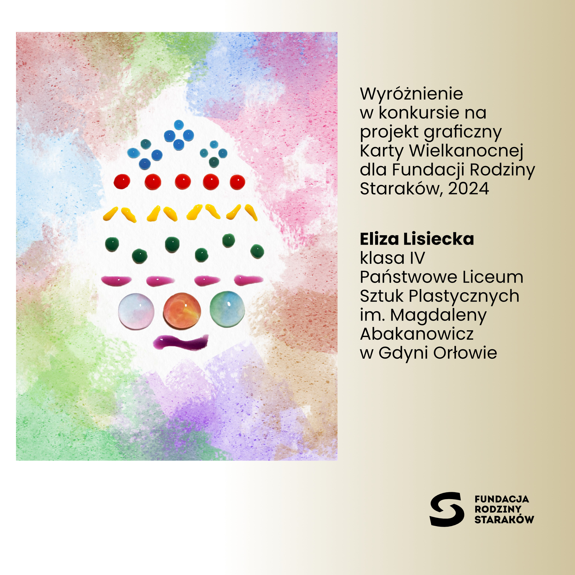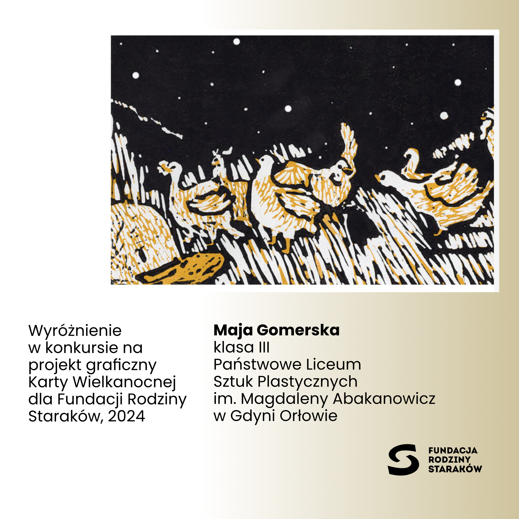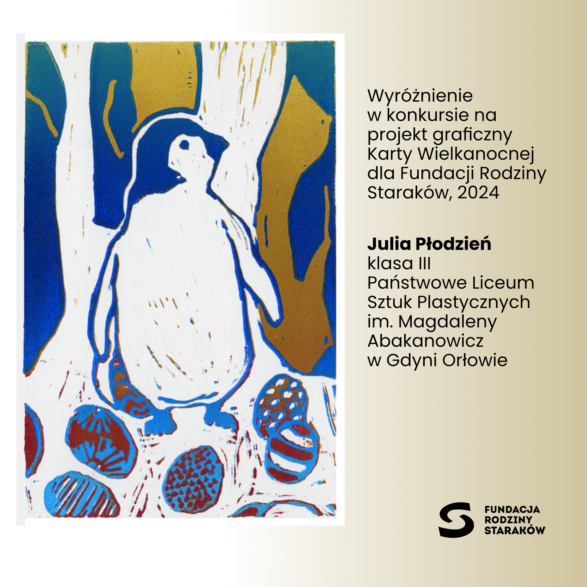 Z przyjemnością informujemy, że prace uczennic Julii Płodzień, Mai Gomerskiej, Mai Szukiel oraz Elizy Lisieckiej zdobyły WYRÓŻNIENIA w konkursie na projekt karty wielkanocnej 2024 dla Fundacji Rodziny Staraków.