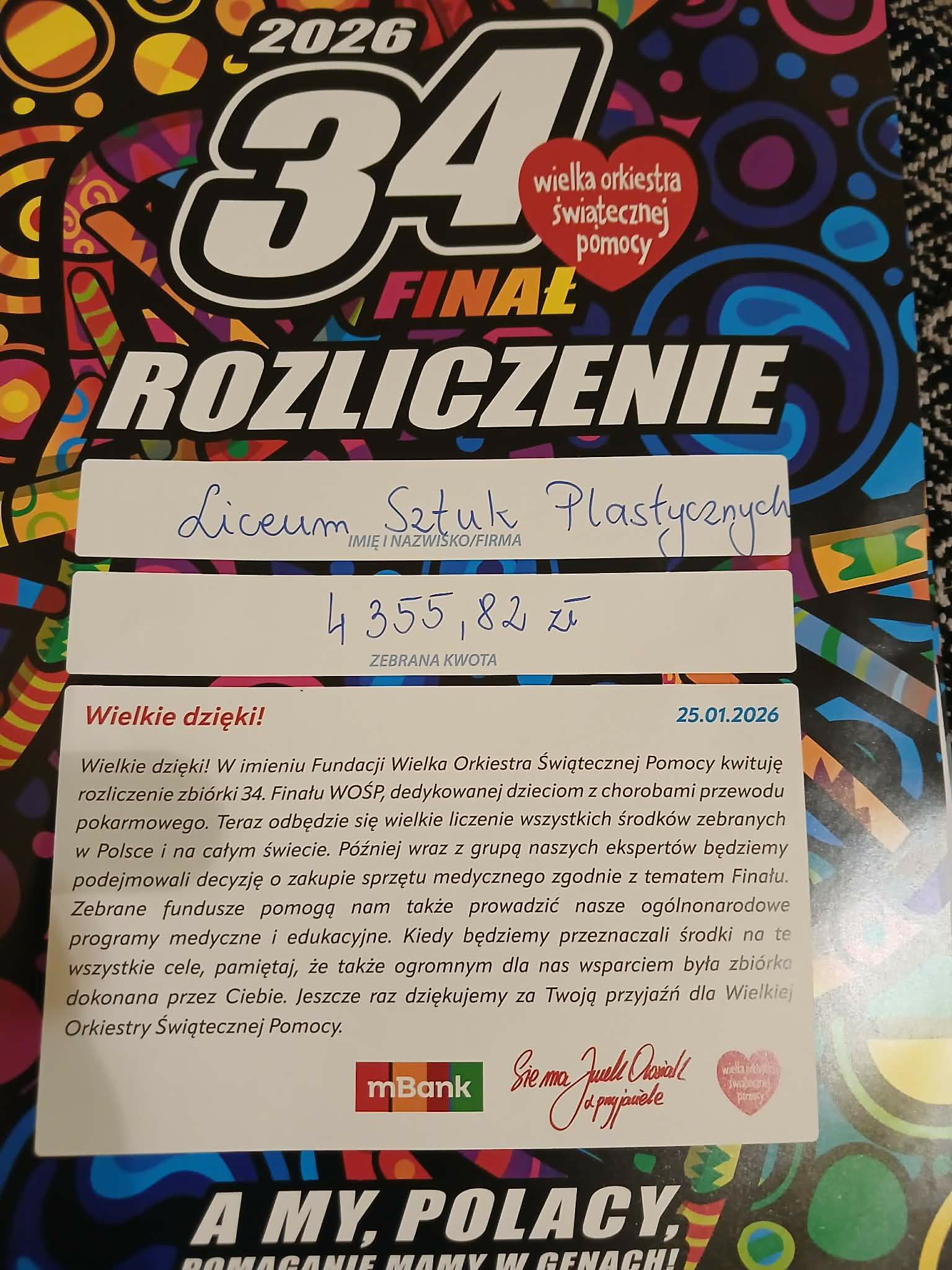 Uczniowie Liceum Sztuk Plastycznych włączyli się aktywnie w zbiórkę Wielkiej Orkiestry Świątecznej Pomocy. Szczególną uwagę zwracała grupa uczennic, która nie tylko zachęcała przechodniów do udziału w akcji, ale także umilała czas grając na gitarze oraz śpiewając i tworząc wyjątkową, pełną energii atmosferę.