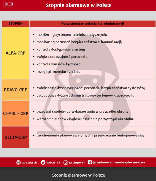 Przypominamy, iż Prezes Rady Ministrów Donald Tusk podpisał zarządzenia wprowadzające stopnie alarmowe: 2. stopnia BRAVO i 2. stopnia BRAVO-CRP na terenie całego kraju oraz 2. stopnia BRAVO wobec polskiej infrastruktury energetycznej, mieszczącej się poza granicami Rzeczypospolitej Polskiej.