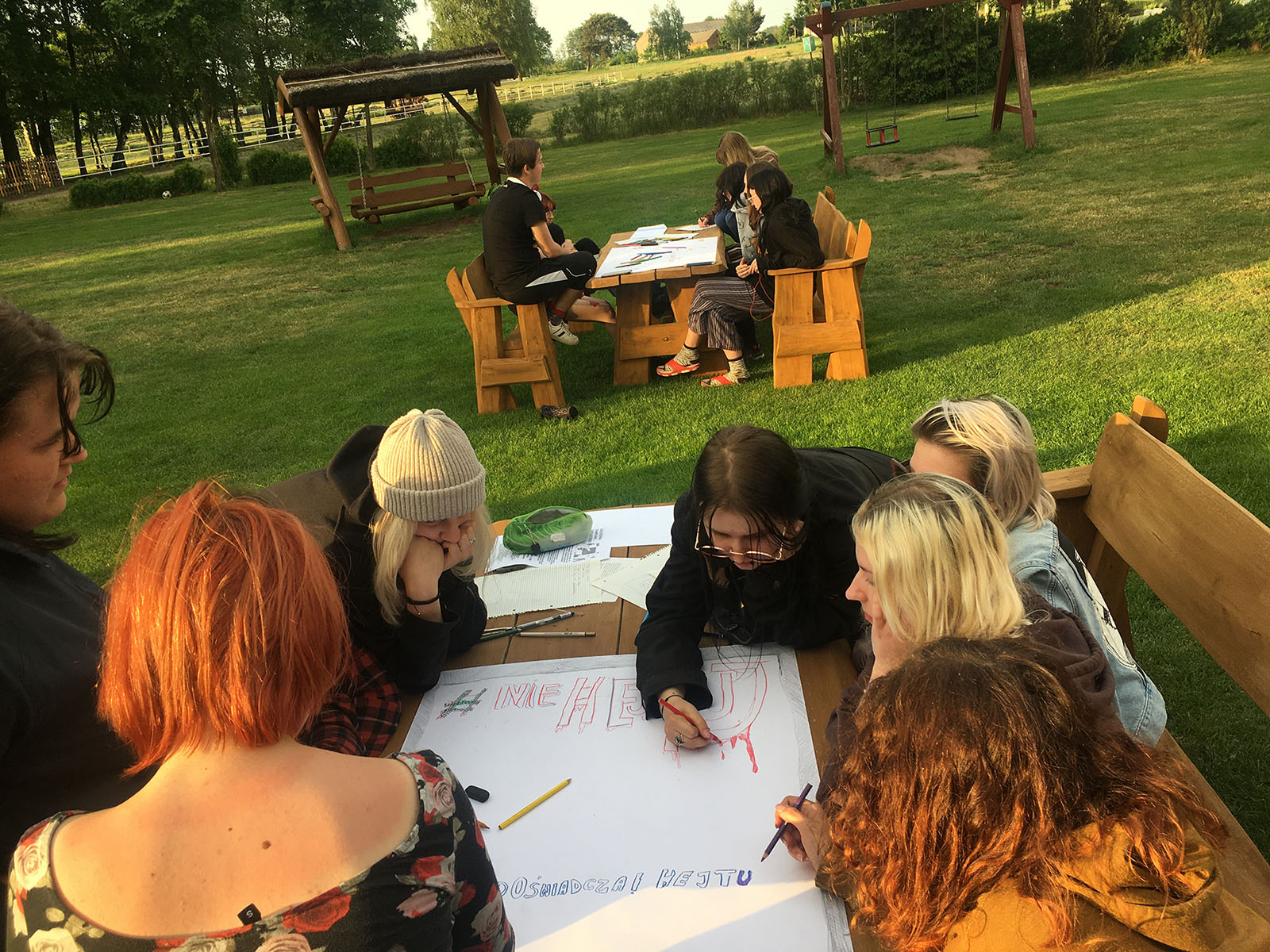 Podczas trwania plenerów szkolnych, po realizacji zadań malarskich, nasze panie psycholog zrealizowały z uczniami warsztaty pt:” Współczesna młodzież wobec pojawiających się zagrożeń”. Uczniowie opracowywali szkice kampanii społecznych propagujących zachowania prozdrowotne.