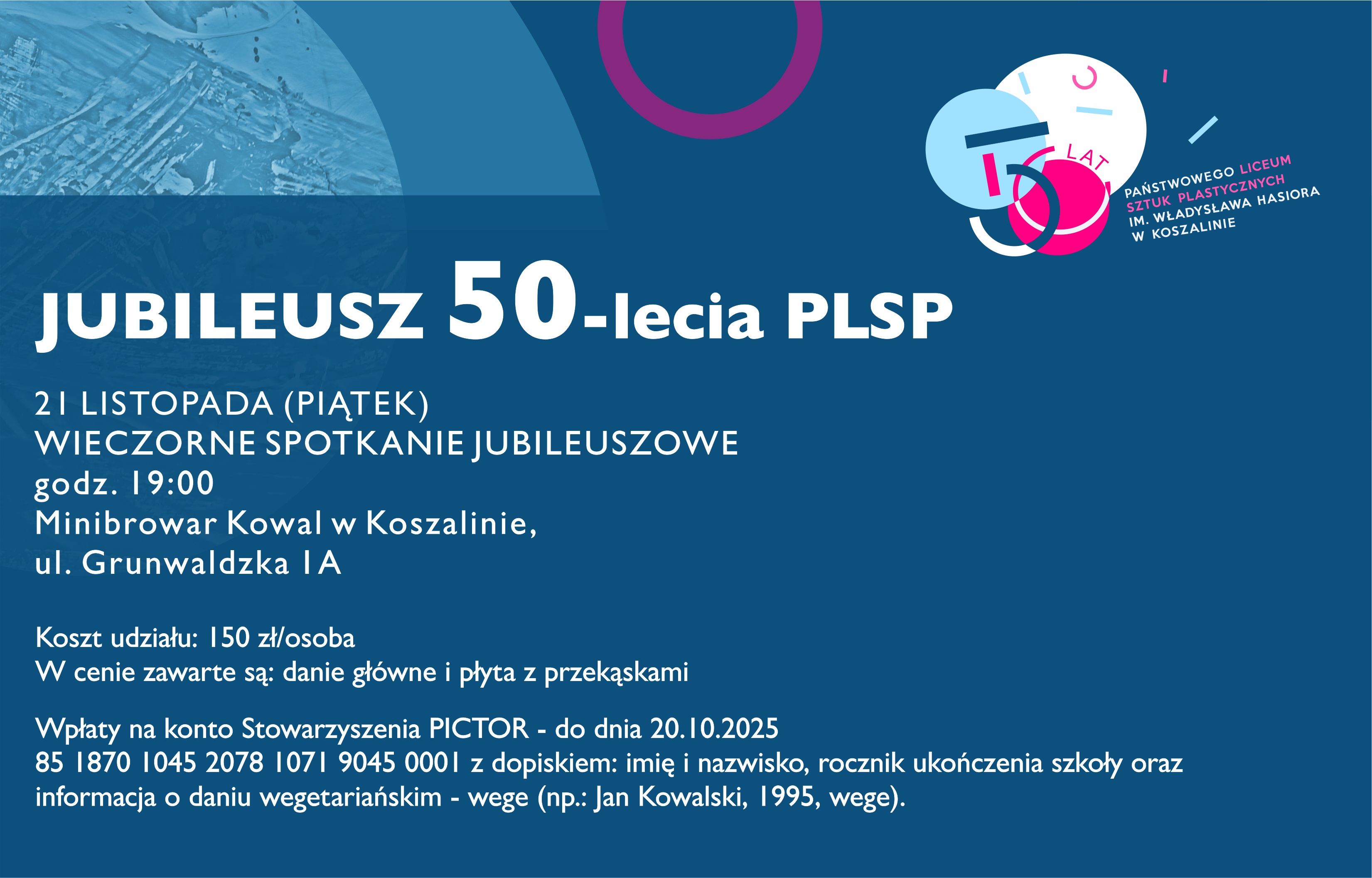 Seredcznie zapraszamy Was w dniu 21 listopada 2025 (piątek) - dzień obchodu Jubileuszu 50-lecia Państwowego Liceum Sztuk Plastyczncych im. Władysława Hasiora w Koszalinie.