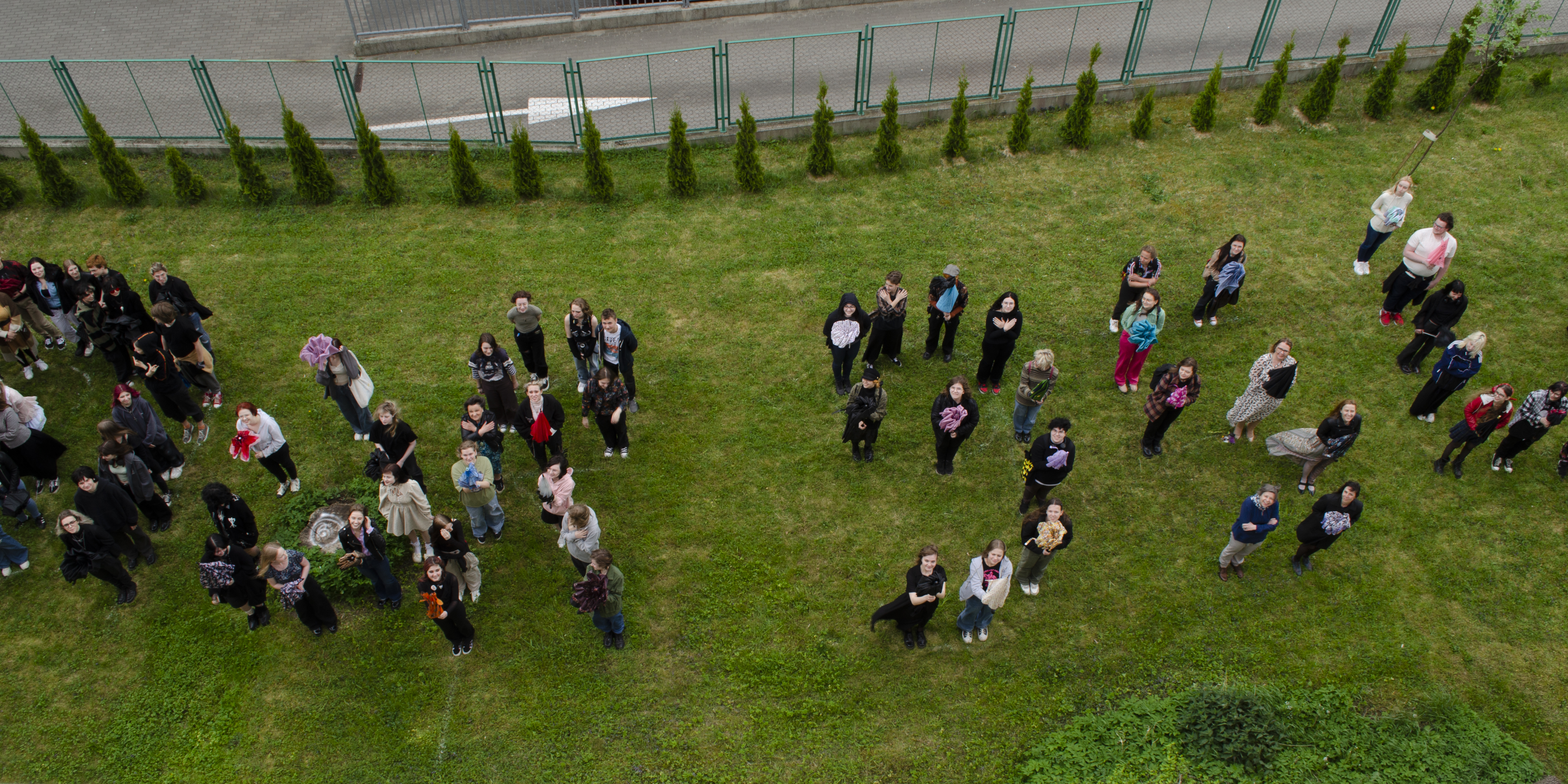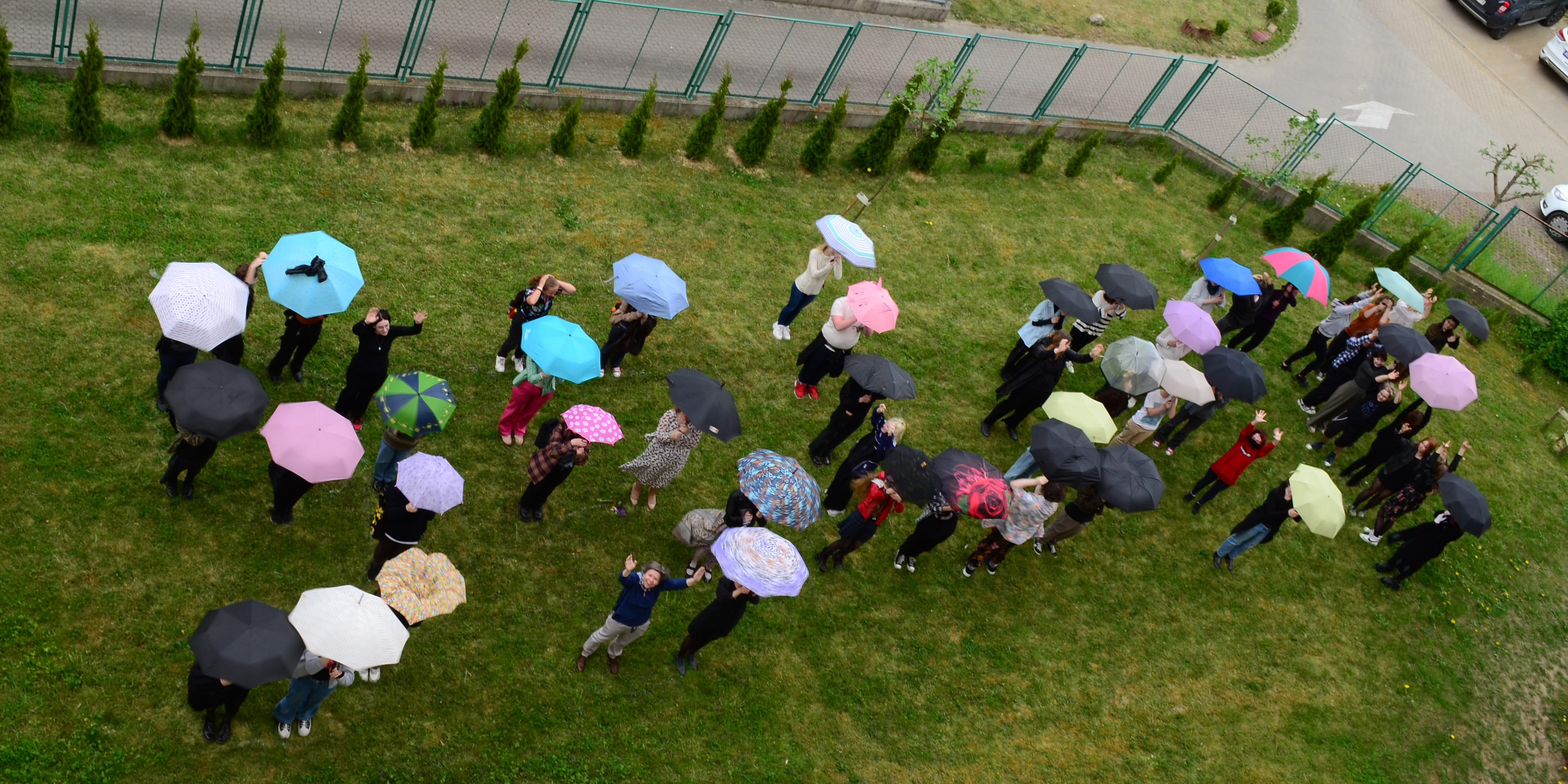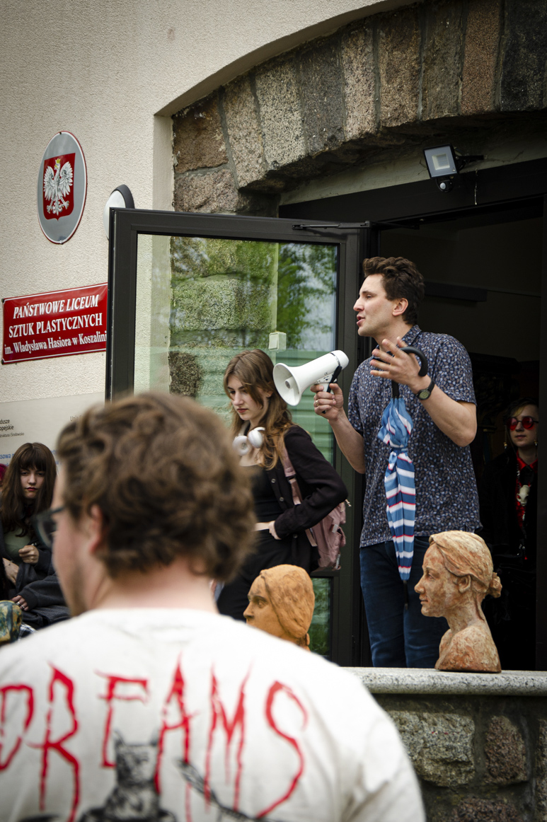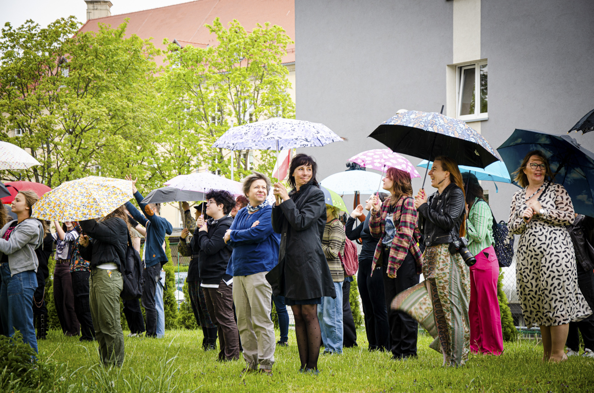 Następnie w szkole odbył się happening, którego pomyslodawcą był pan Tomasz Majerski (nauczyciel historii sztuki). Hasior w swojej twórczości był zainteresowany zwykłym przedmiotem, który zazwyczaj w zaskakujący sposób zestawiał z innymi dziedzinami sztuki: tkaniną, rzeźbą plenerową, scenografią, happeningiem itp. Dla artysty był to mocny gest plastyczny zazwyczaj o znaczeniu metaforycznym. Nawiązując do tej tradycji i samego Hasiora uczniowie oraz nauczyciele przynieśli do szkoły w tym dniu PARASOL. Akcja polegała na stworzeniu żywego a jednocześnie barwnego napisu na terenach zielonych. Całe wydarzenie zarejestrowaliśmy wykonując pamiątkowe fotografie.