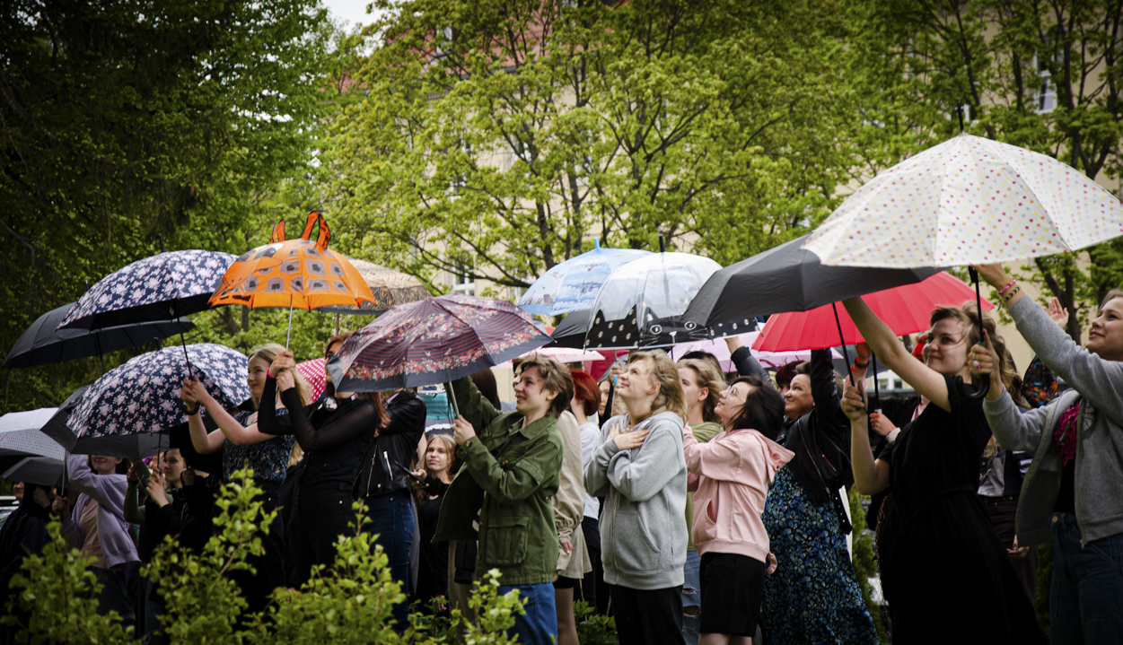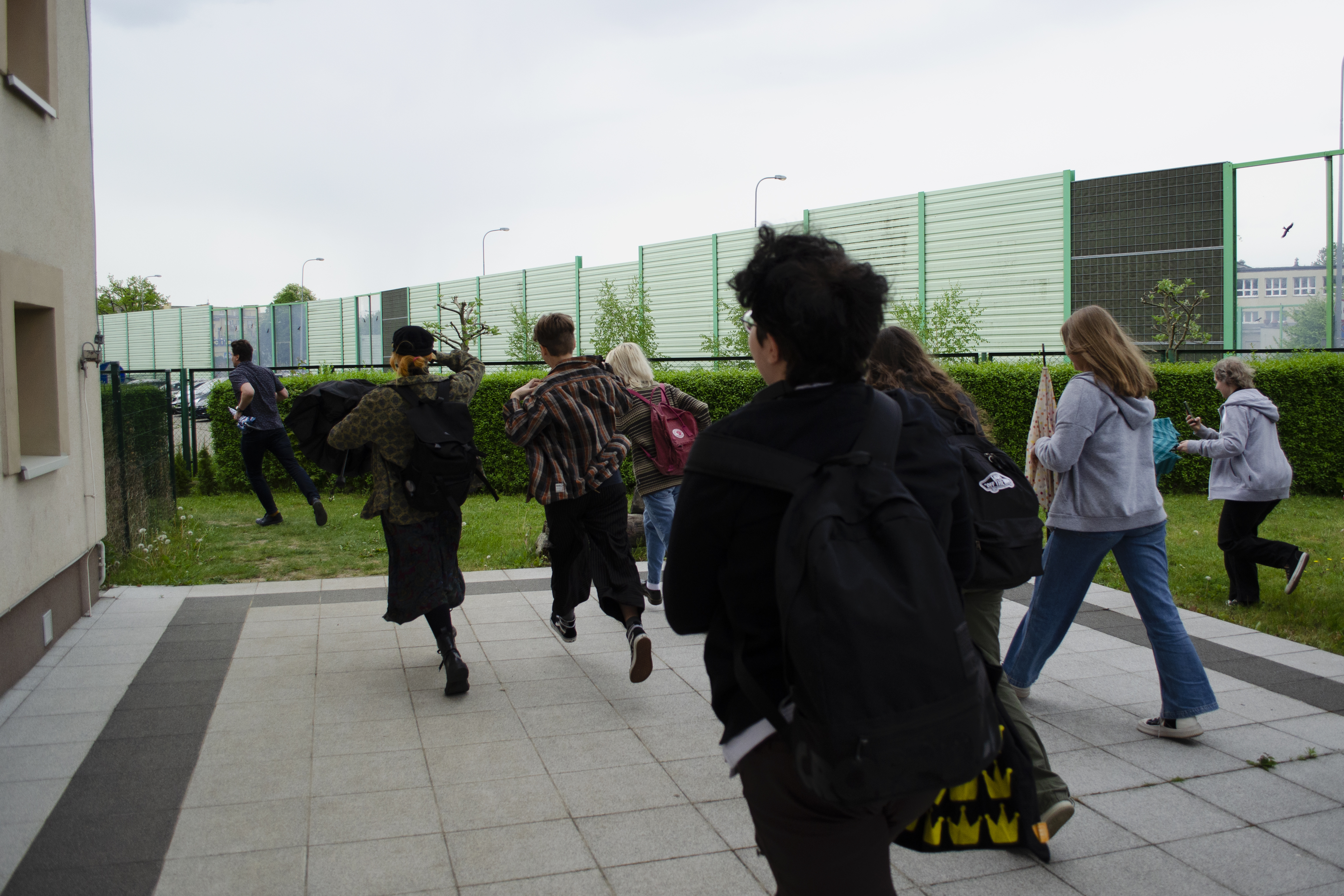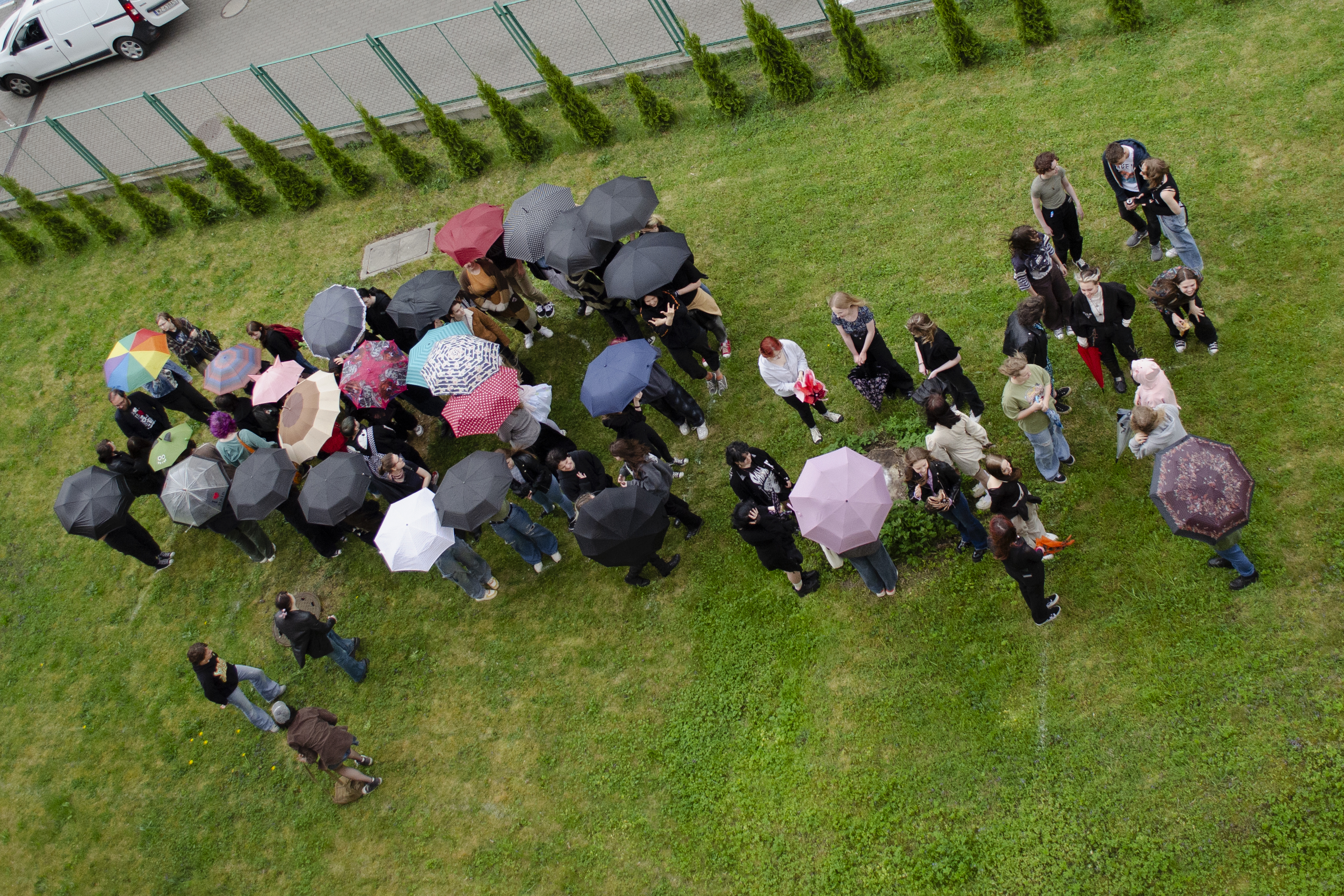 Następnie w szkole odbył się happening, którego pomyslodawcą był pan Tomasz Majerski (nauczyciel historii sztuki). Hasior w swojej twórczości był zainteresowany zwykłym przedmiotem, który zazwyczaj w zaskakujący sposób zestawiał z innymi dziedzinami sztuki: tkaniną, rzeźbą plenerową, scenografią, happeningiem itp. Dla artysty był to mocny gest plastyczny zazwyczaj o znaczeniu metaforycznym. Nawiązując do tej tradycji i samego Hasiora uczniowie oraz nauczyciele przynieśli do szkoły w tym dniu PARASOL. Akcja polegała na stworzeniu żywego a jednocześnie barwnego napisu na terenach zielonych. Całe wydarzenie zarejestrowaliśmy wykonując pamiątkowe fotografie.